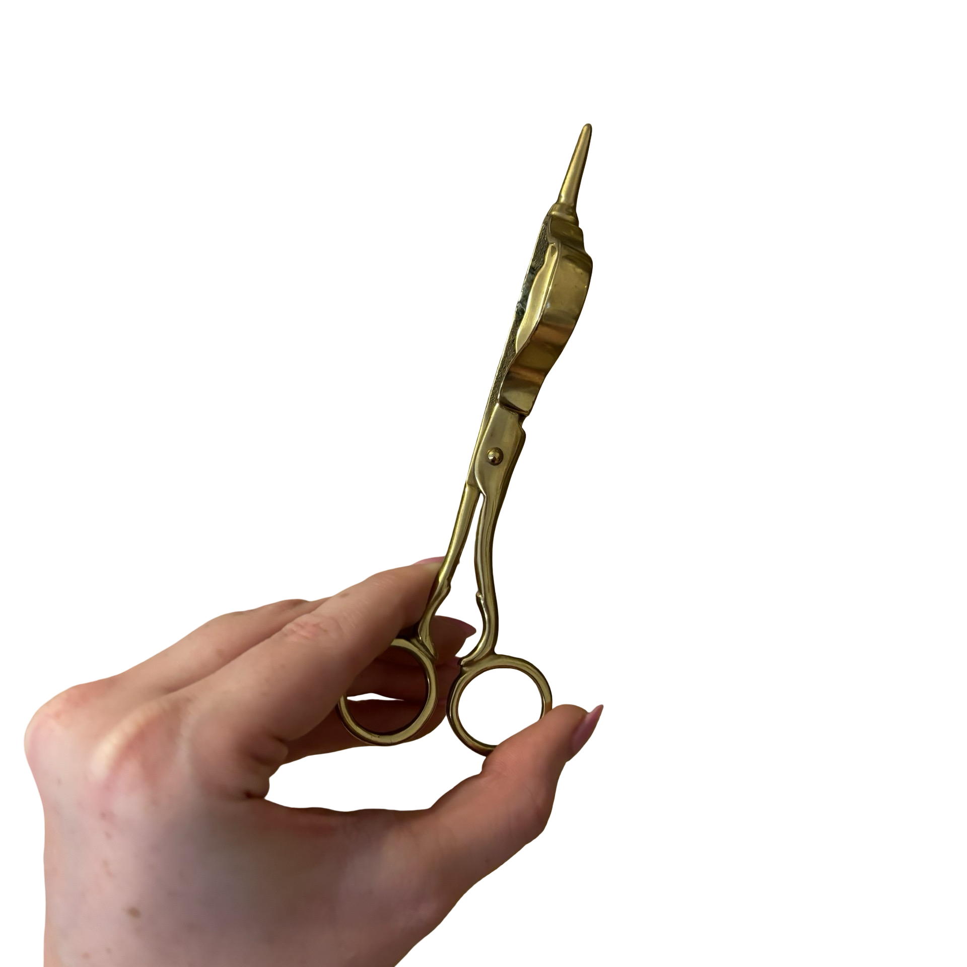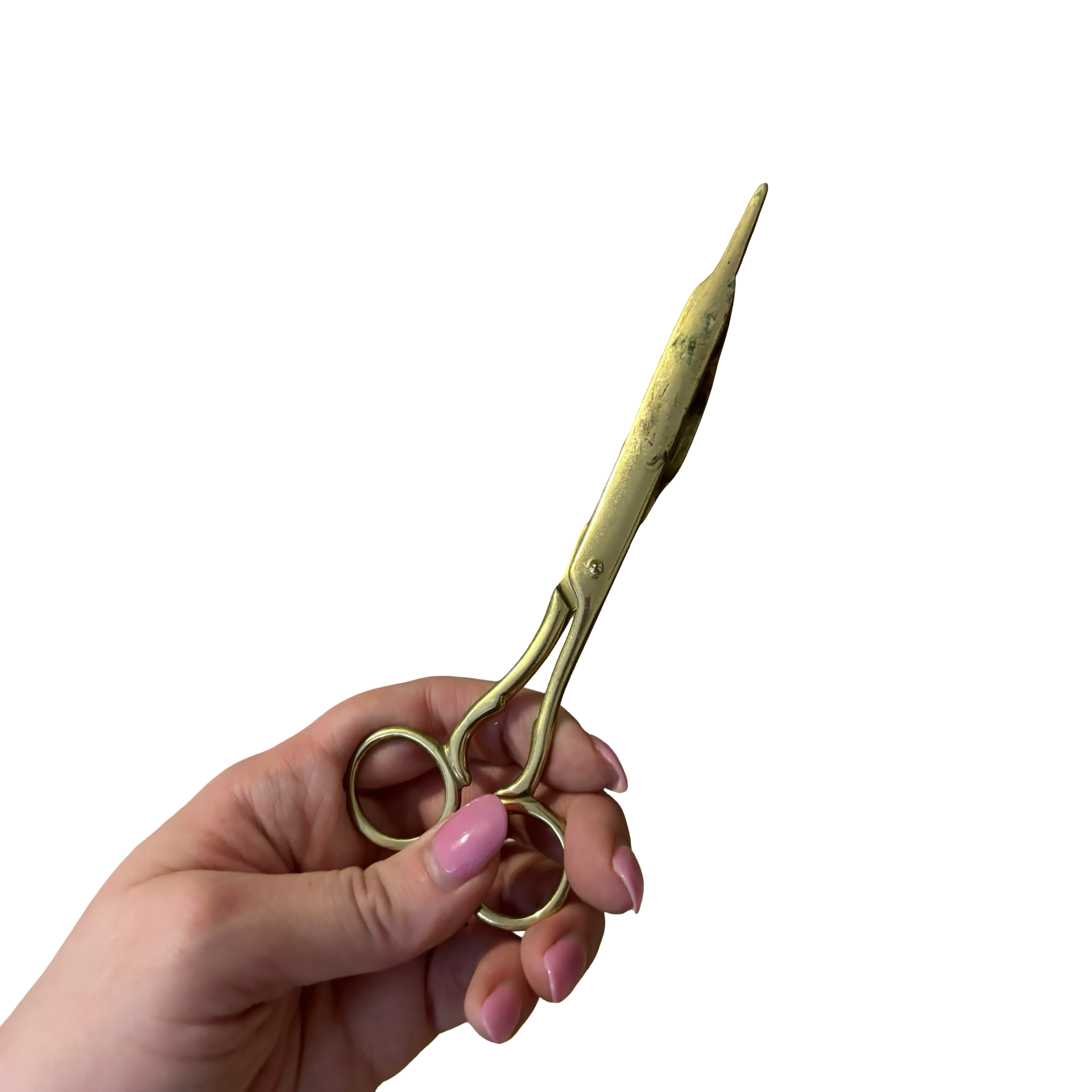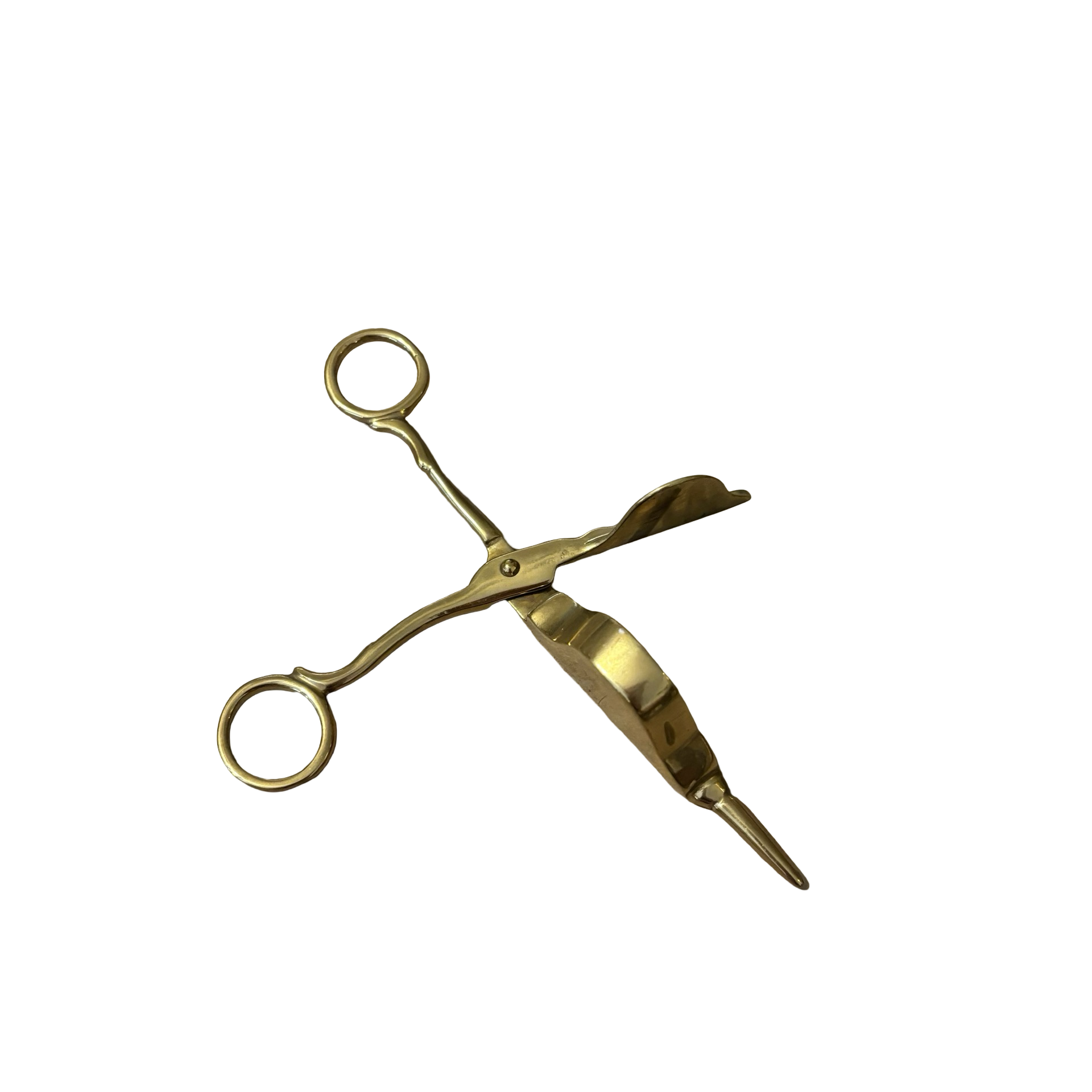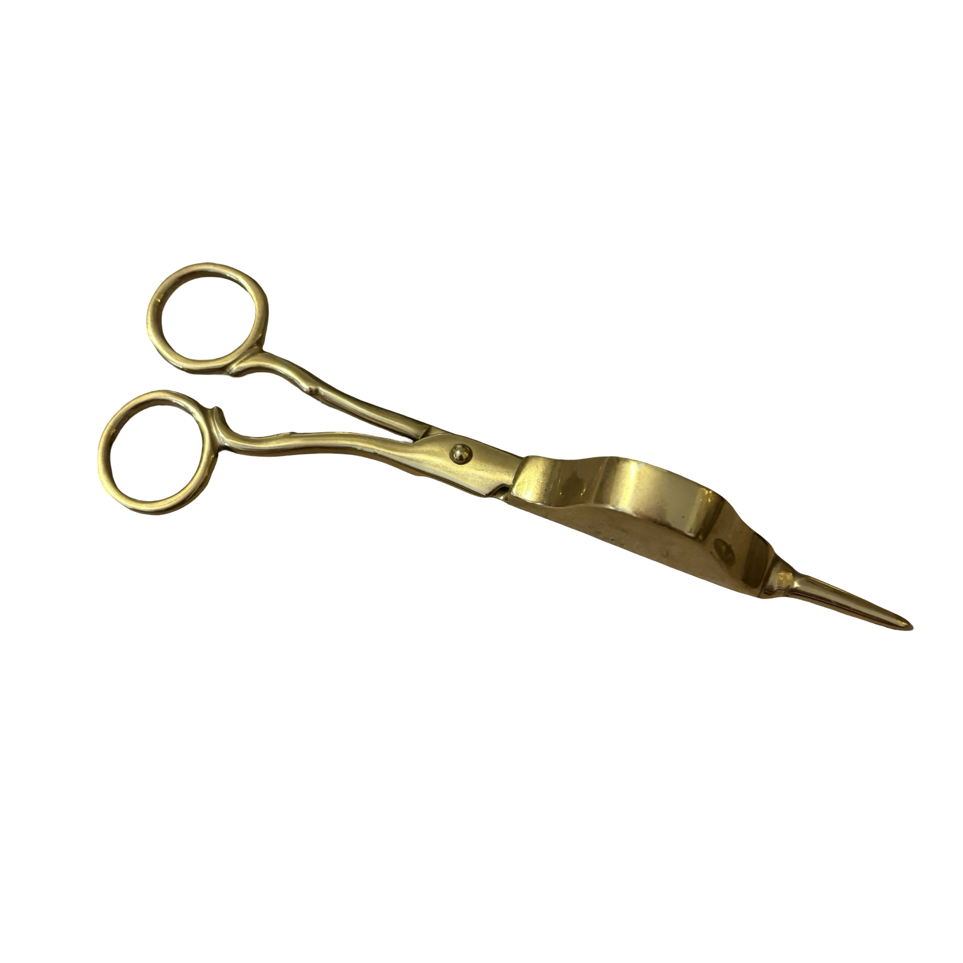 A pair of brass scissors meant for trimming a candle wick in good vintage condition.