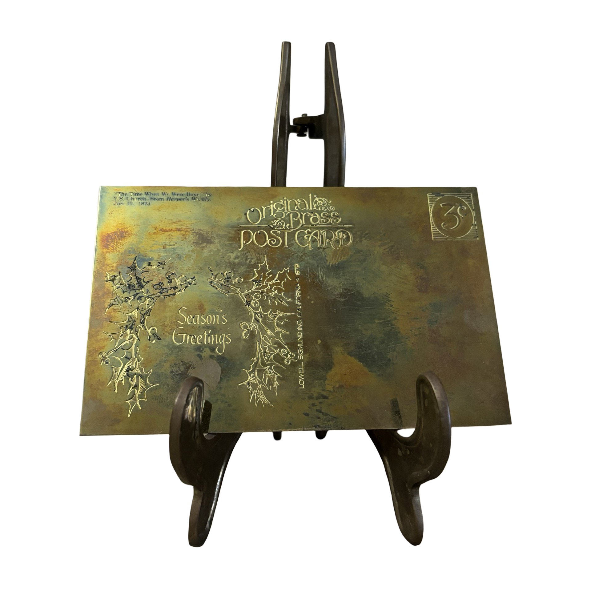 A fabulous brass Christmas Postcard by Sigmund Lowell. I am including a brass stand to accompany this item for display! The stand can hold the item vertically or horizontally and folds for storage. Features artwork on the reverse side. Absolutely stunning! Comes with the original box.