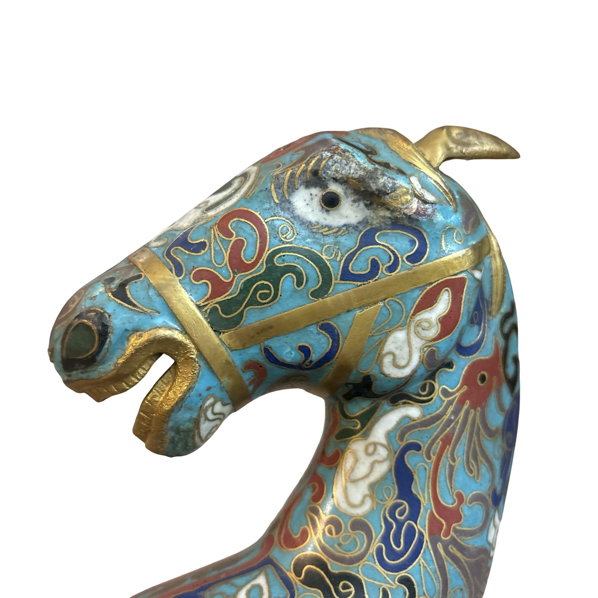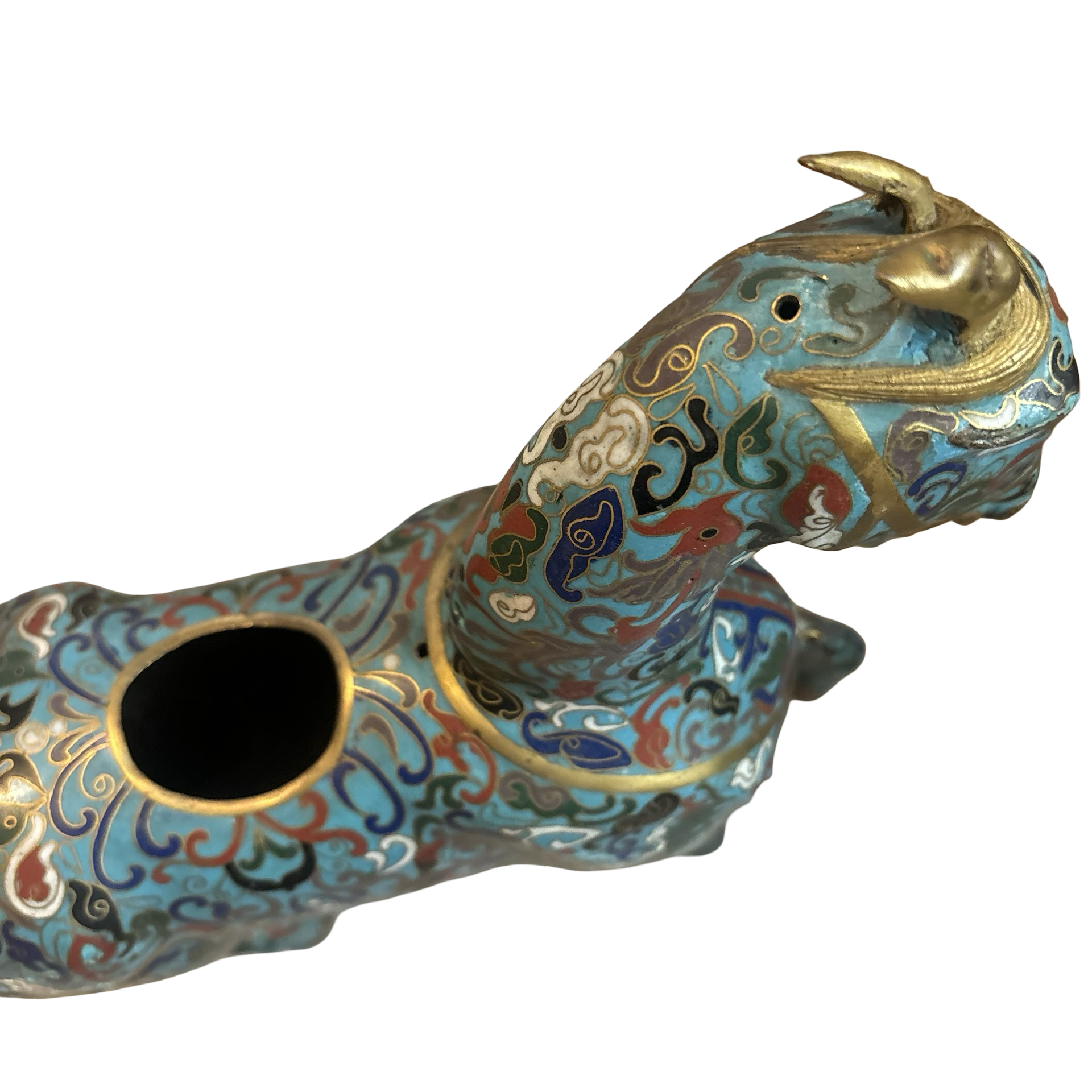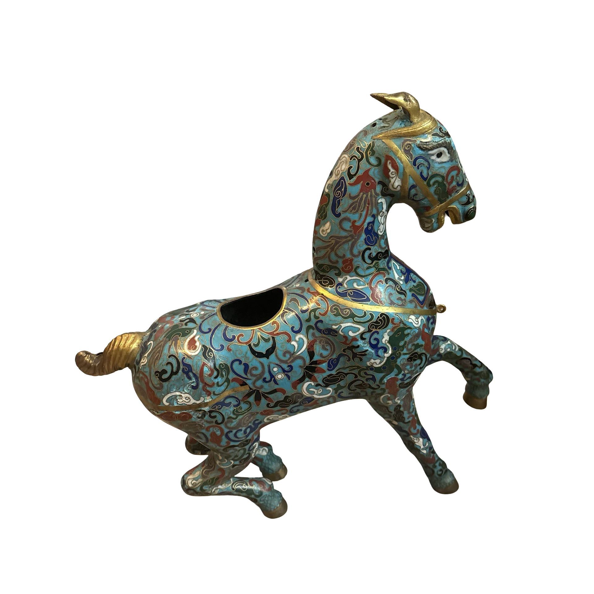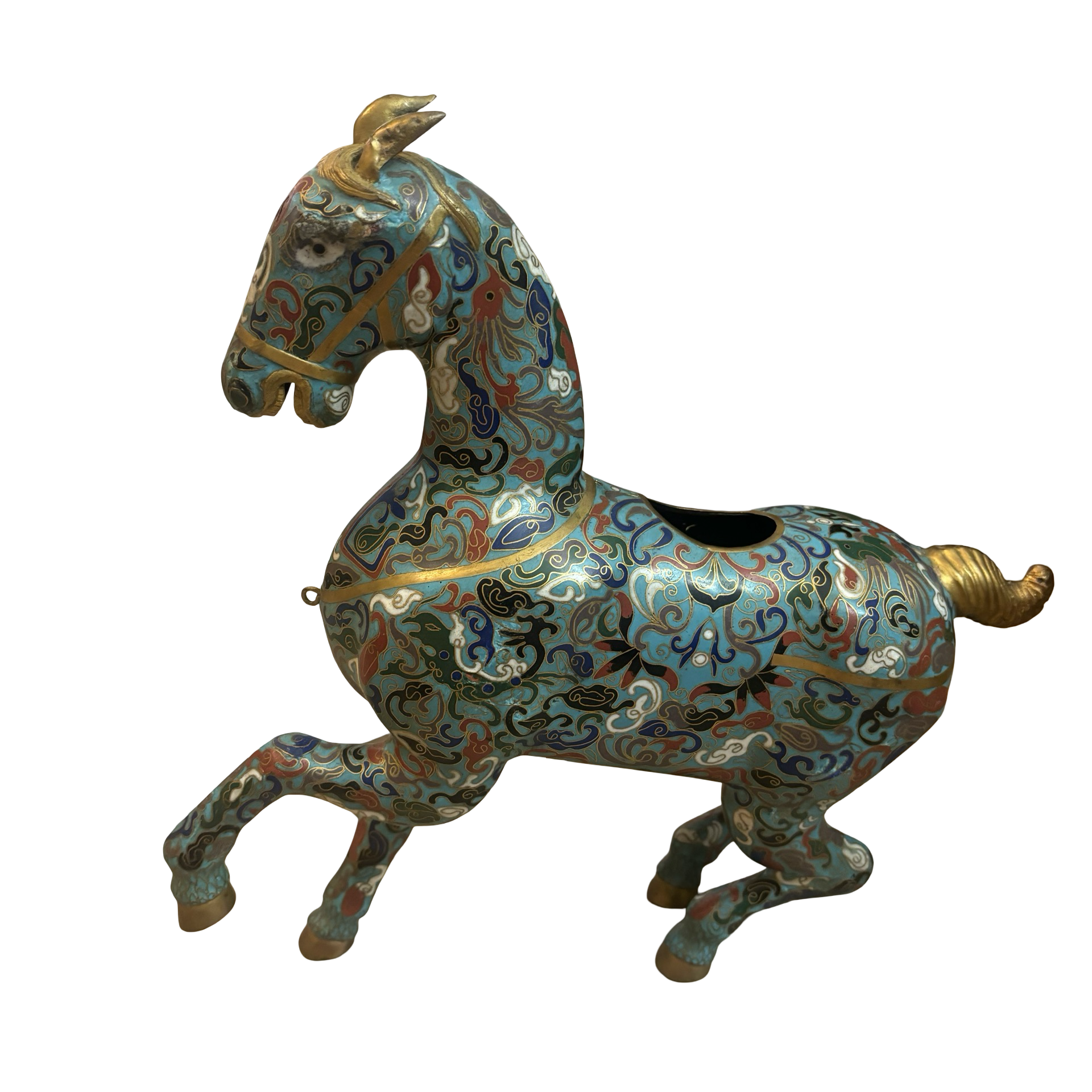 A stunning vintage cloisonné brass horse meant to burn incense inside of! The detailing on this piece is so special. Some normal wear throughout.