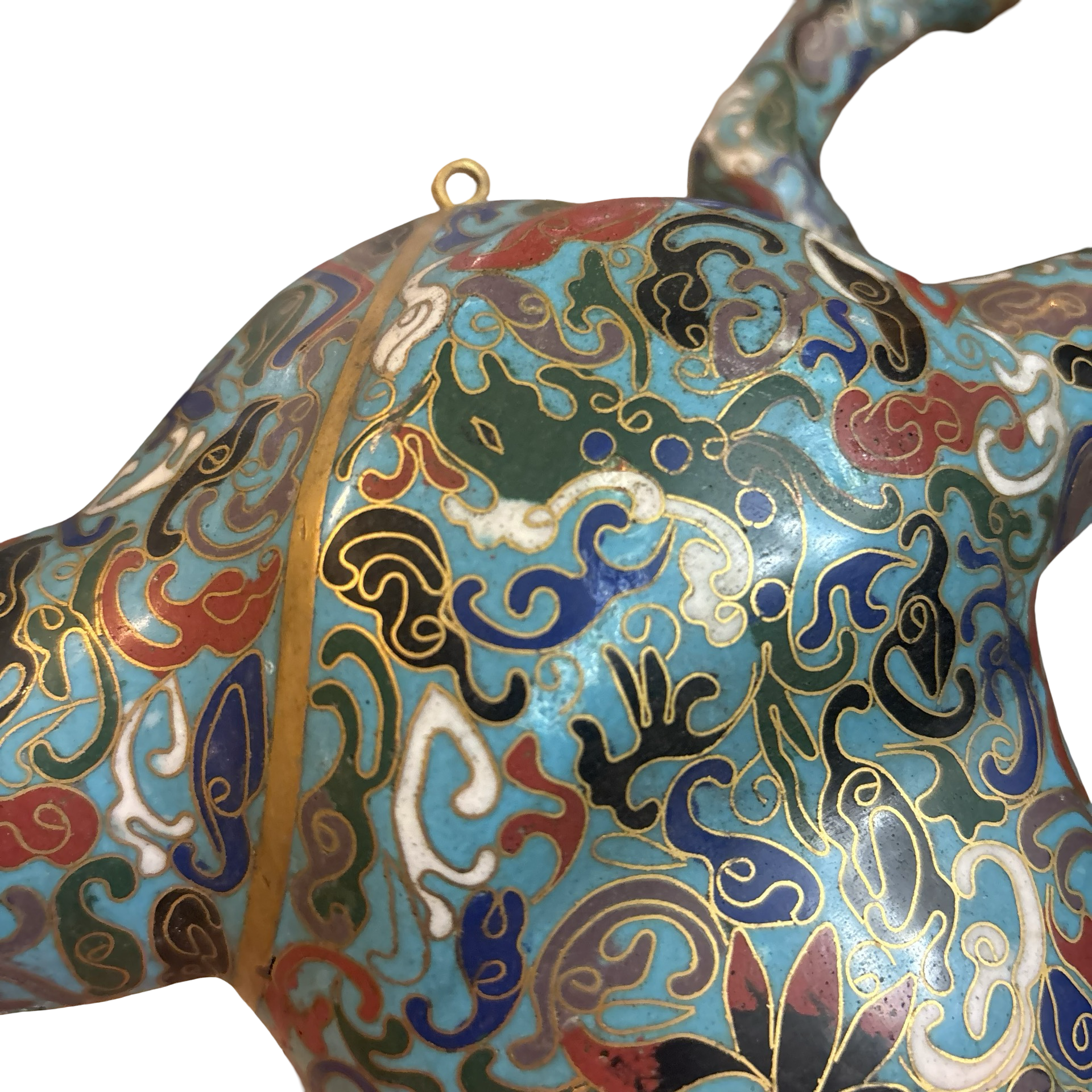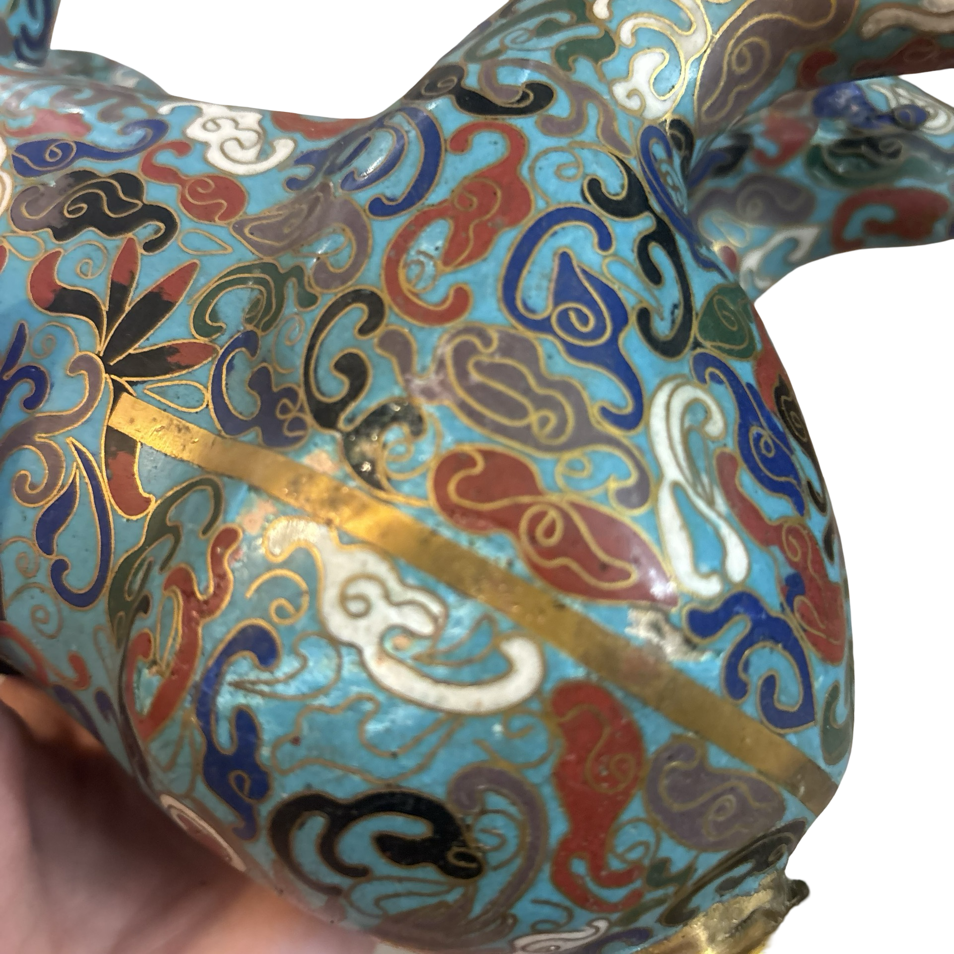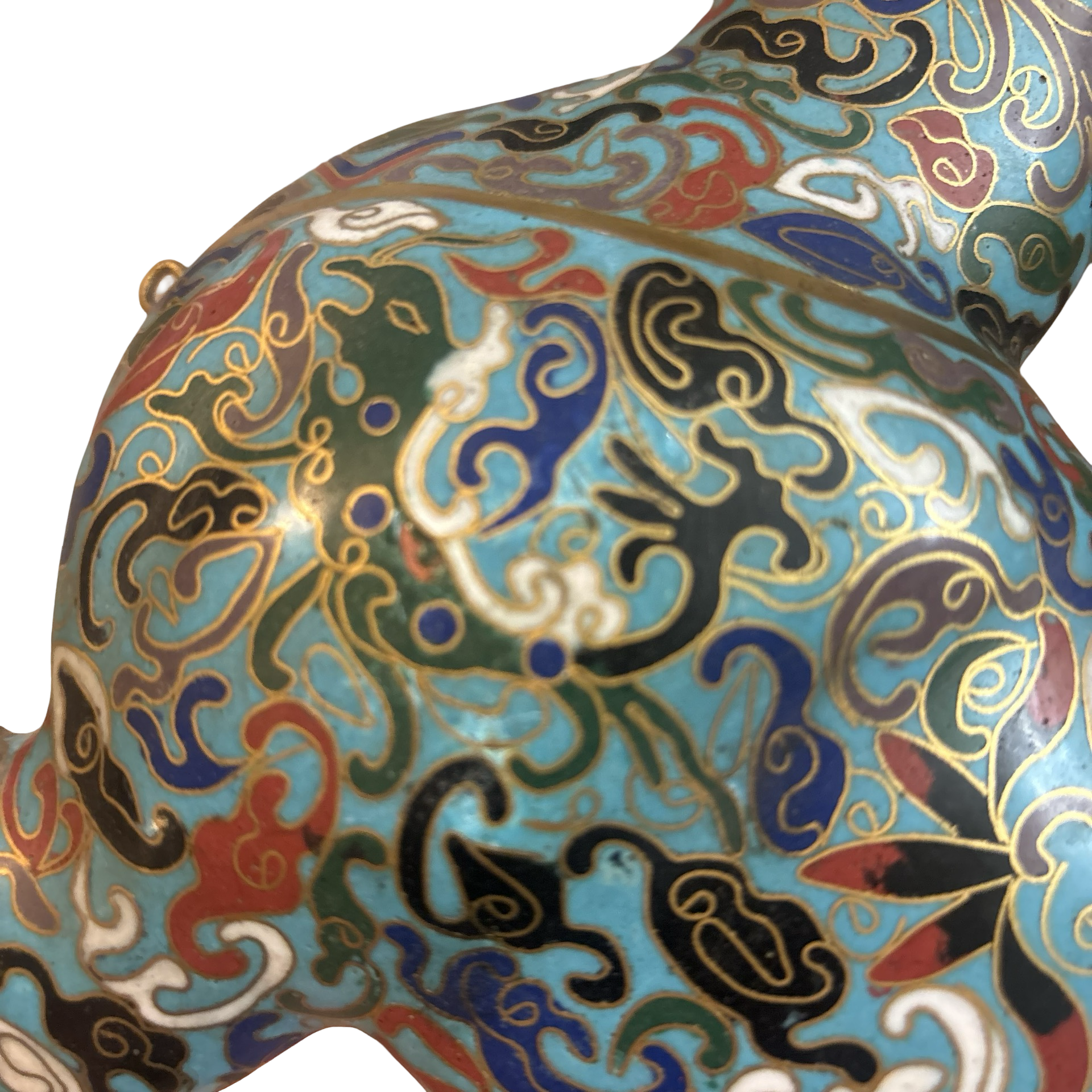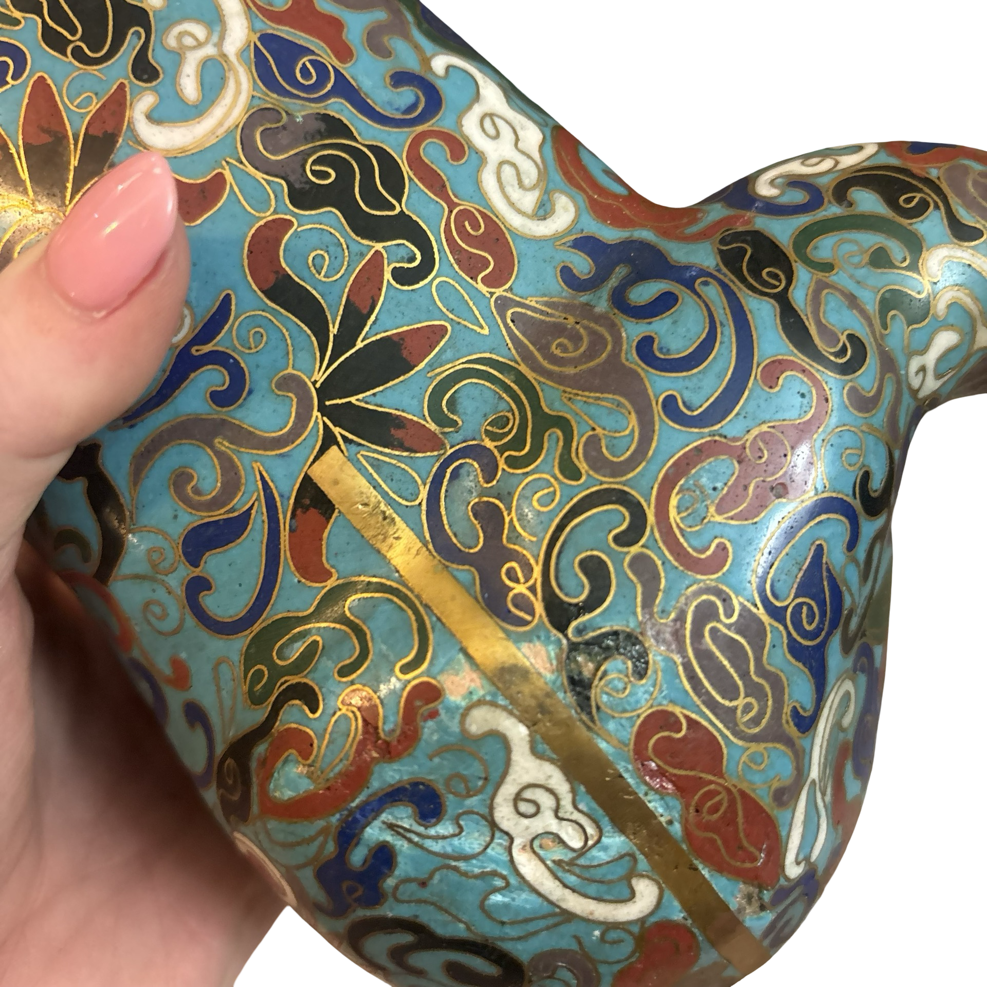 A stunning vintage cloisonné brass horse meant to burn incense inside of! The detailing on this piece is so special. Some normal wear throughout.