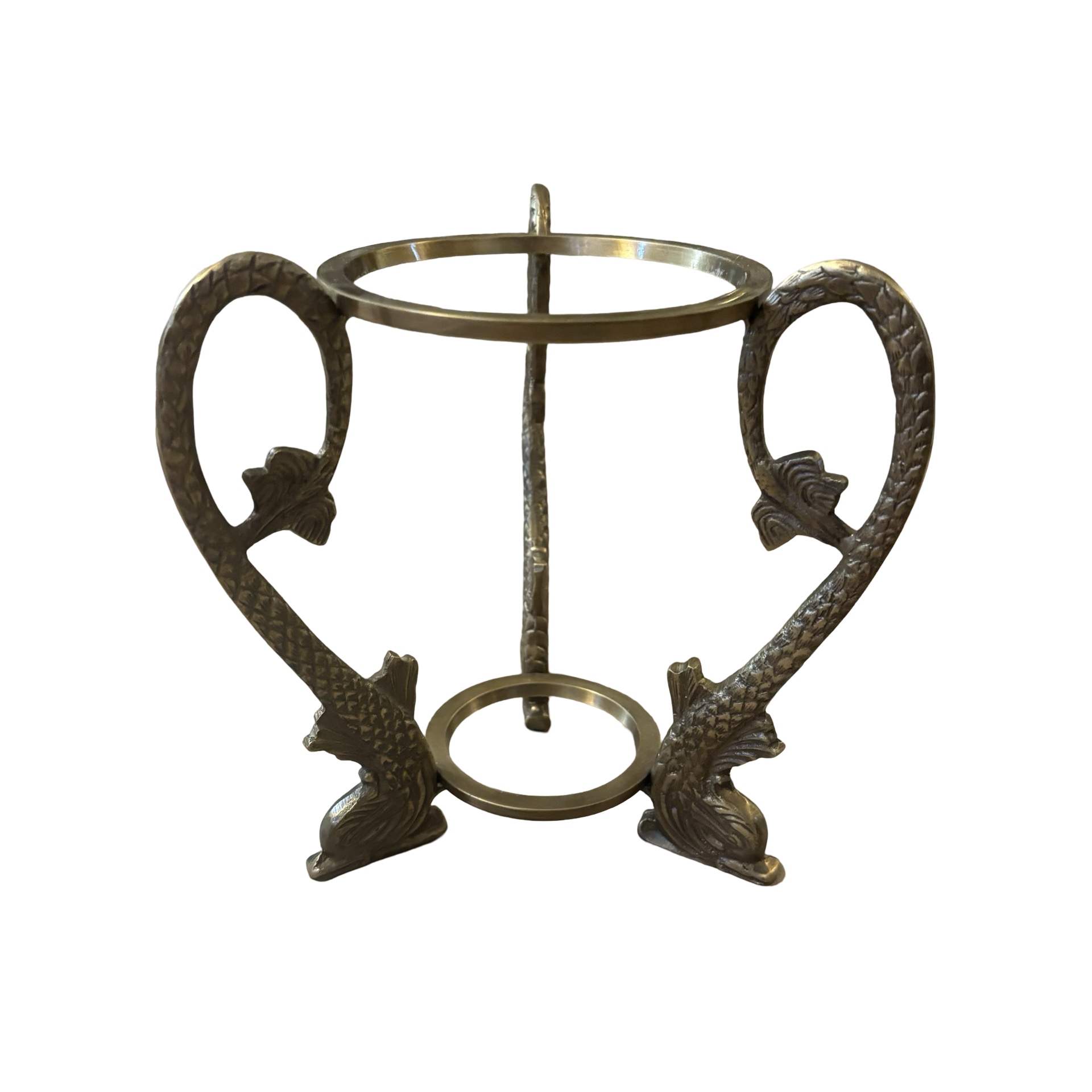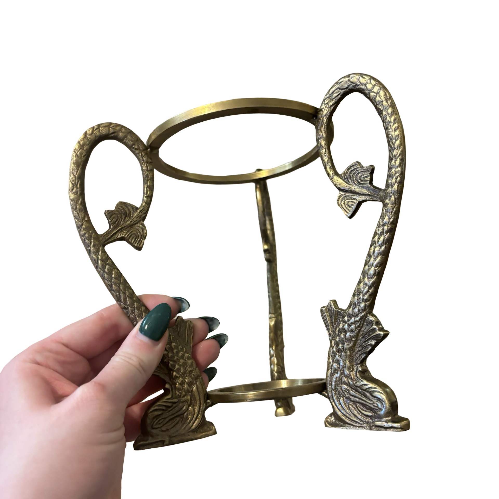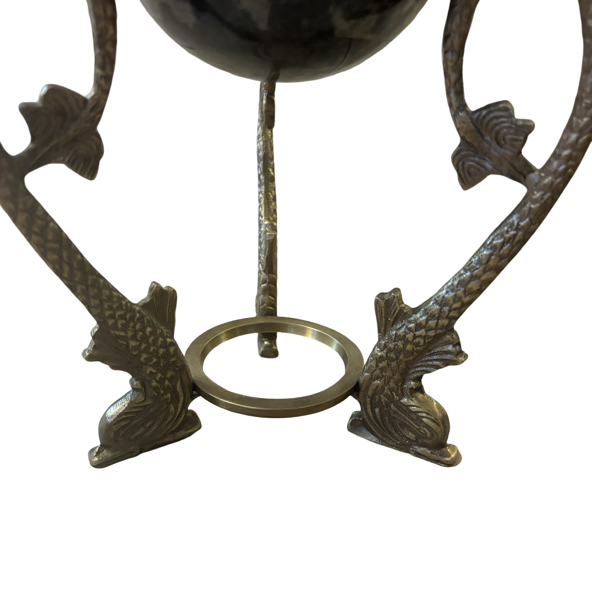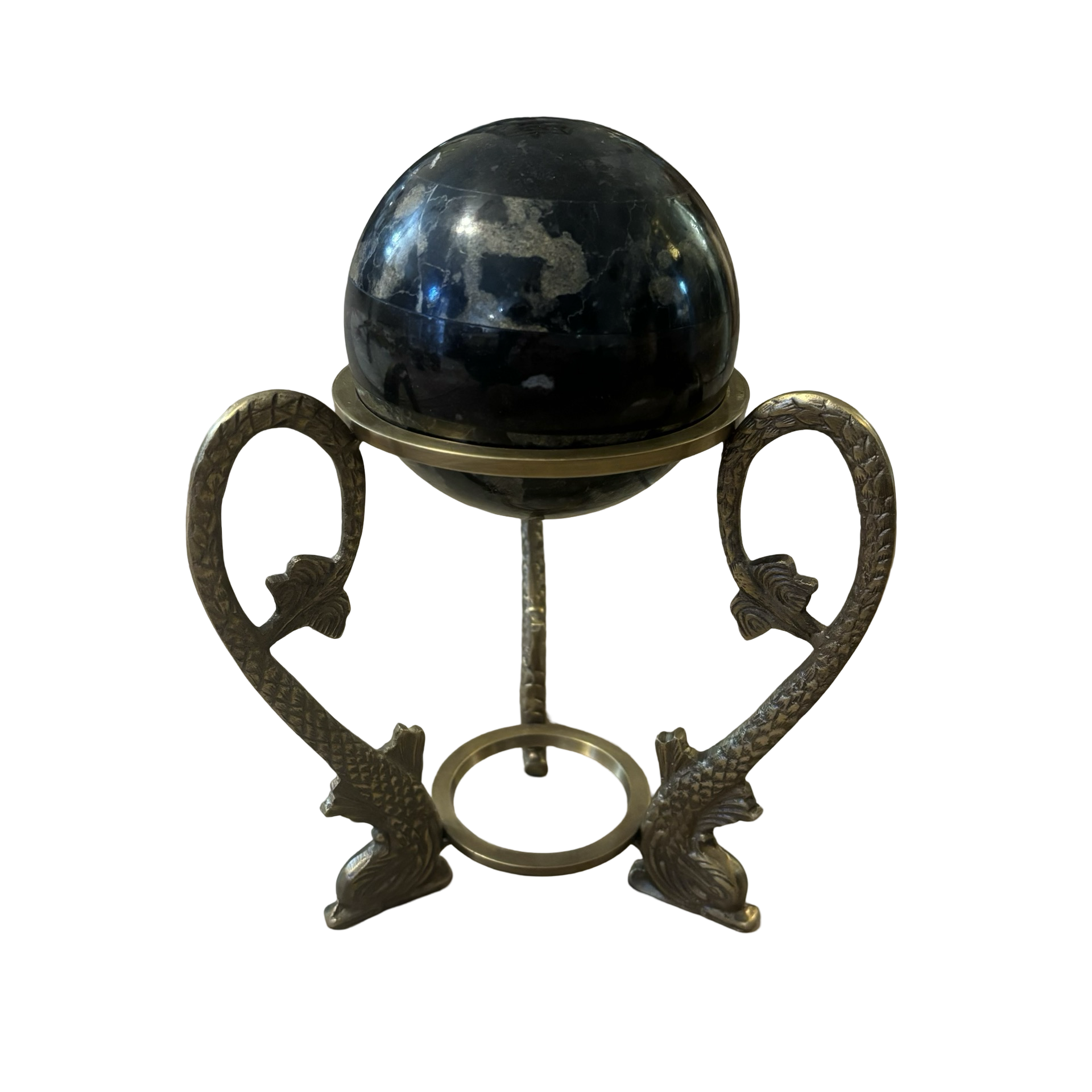 A beautiful brass koi fish stand in good vintage condition paired with a striped marble ball with some minor wear. A stunning (and heavy) combo!