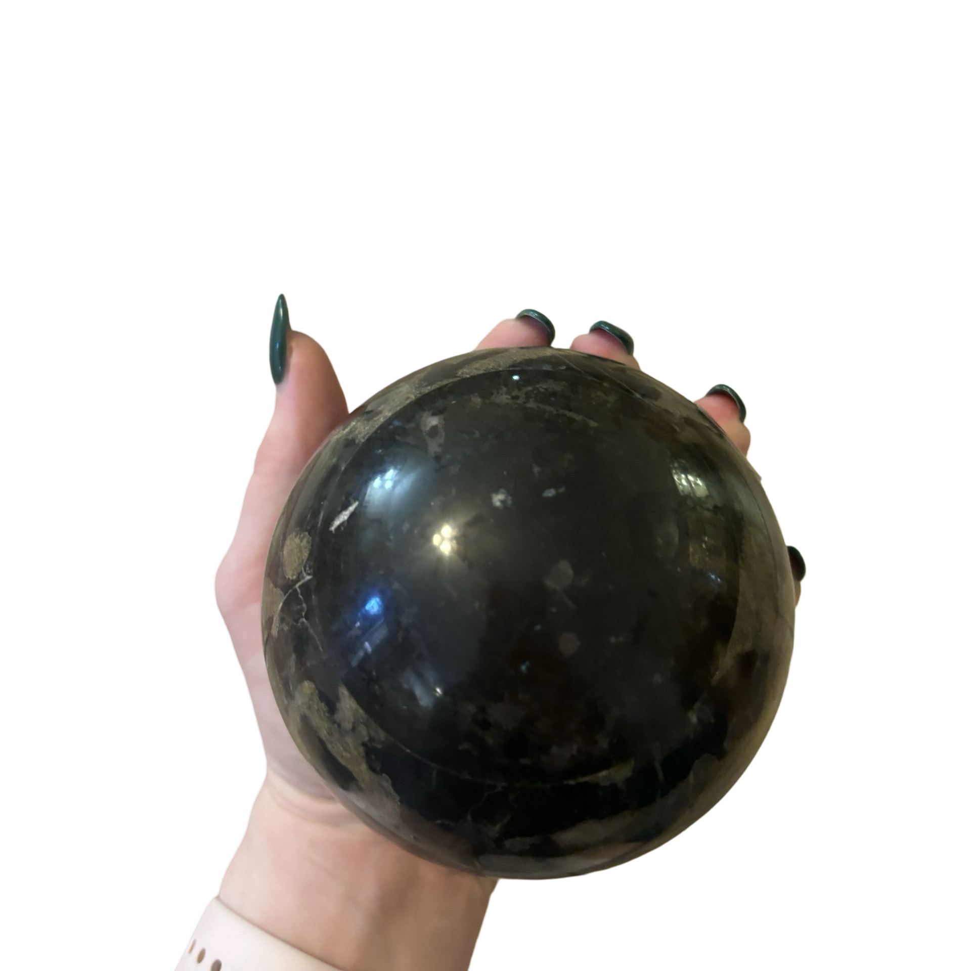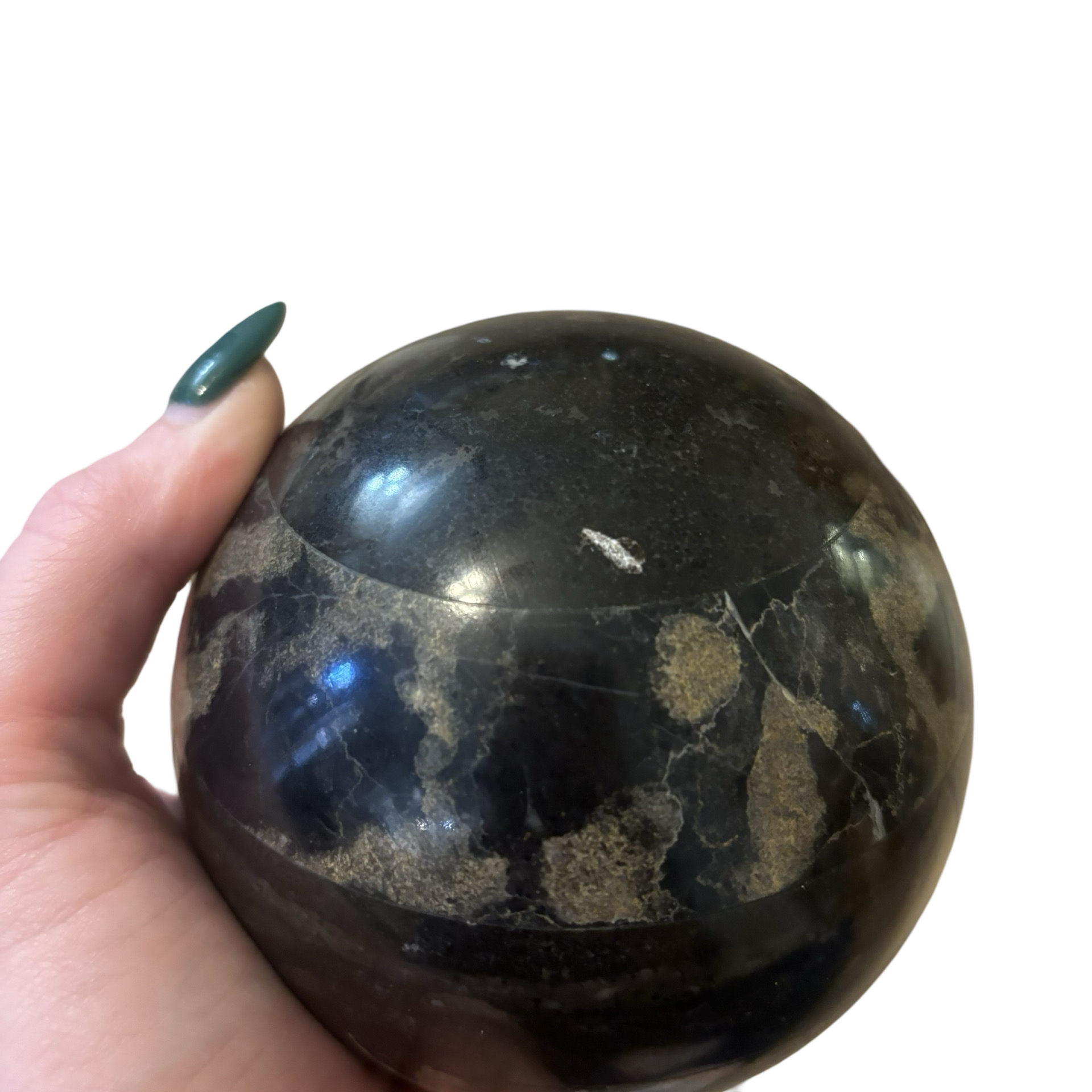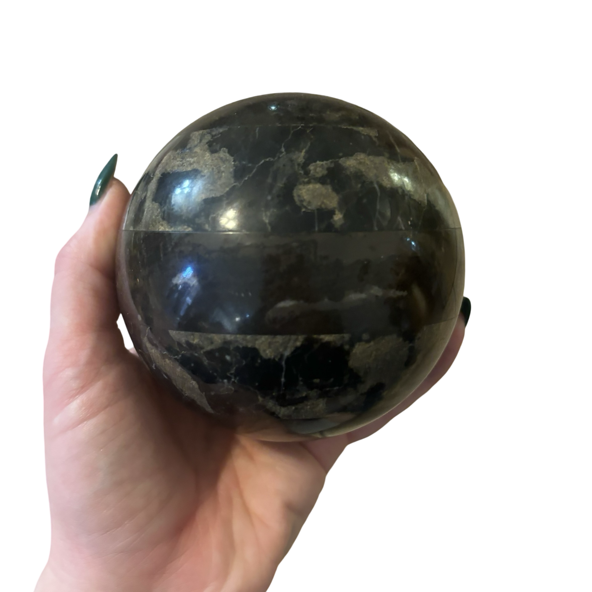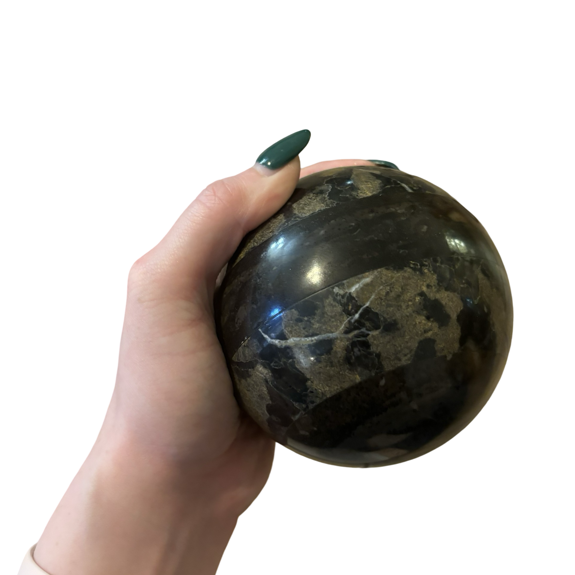 A beautiful brass koi fish stand in good vintage condition paired with a striped marble ball with some minor wear. A stunning (and heavy) combo!