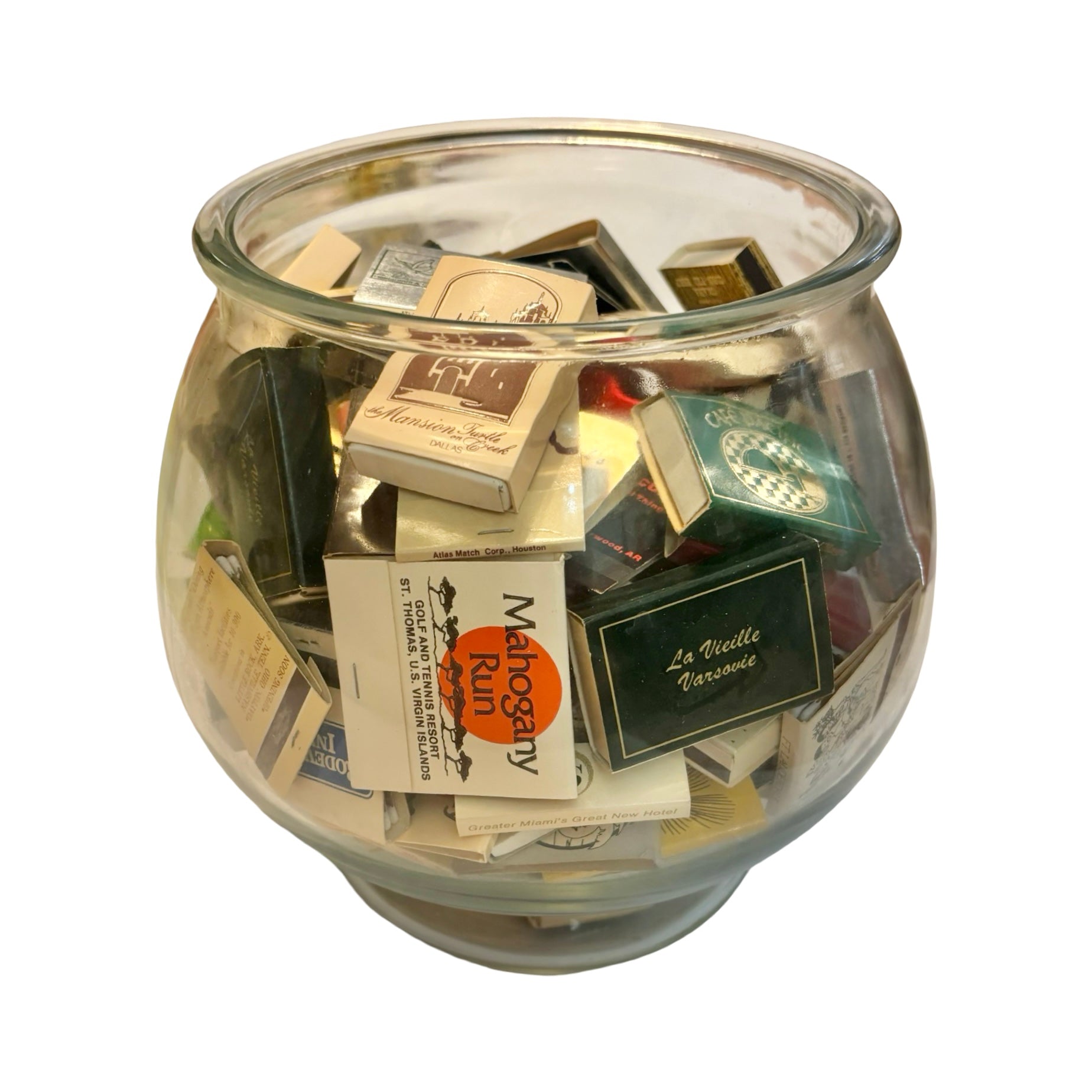 A beautiful and large glass bowl filled with over one hundred vintage matchbooks. Some matches have been used, some are full of matches. You’ll find matchbooks from the Dallas area and all over the world!