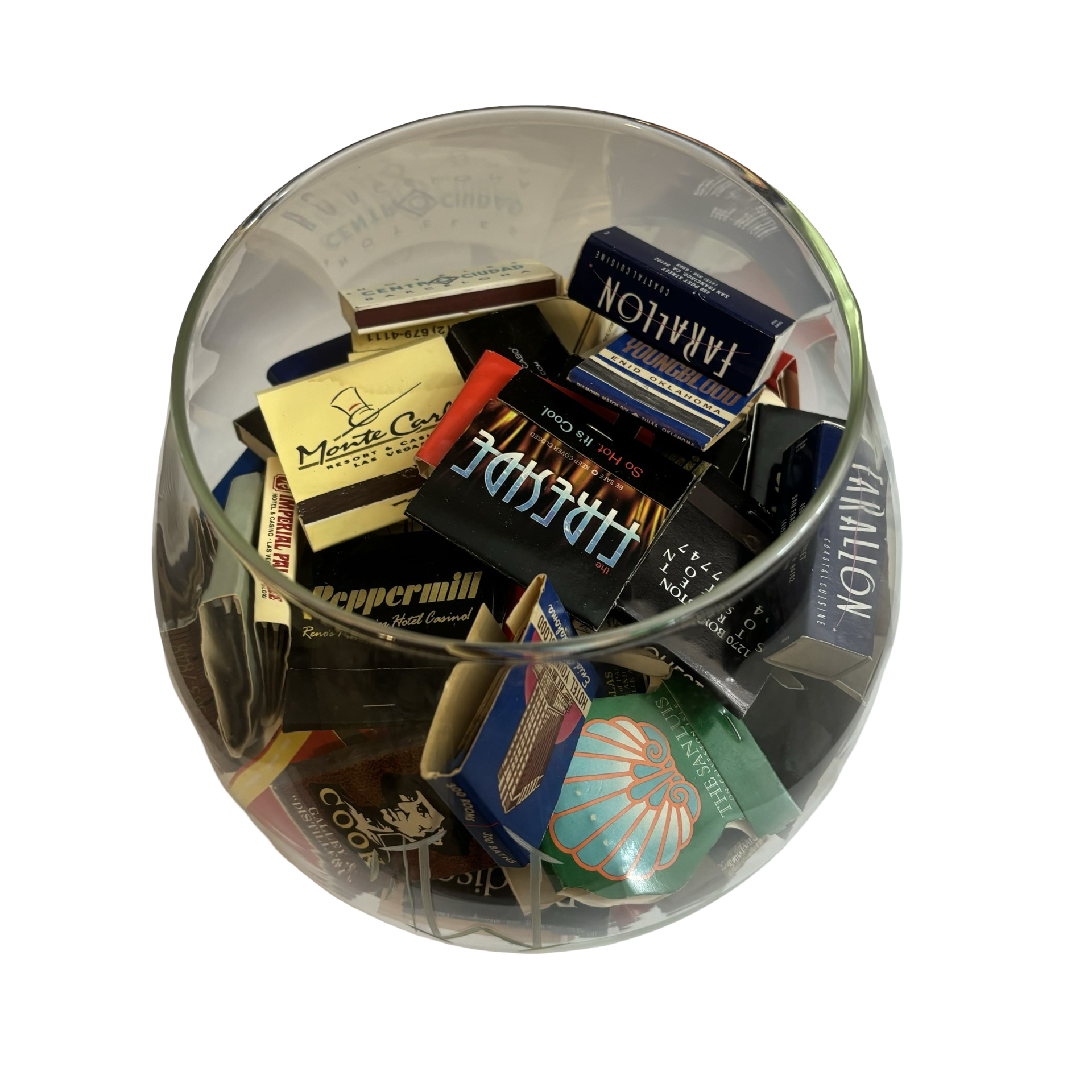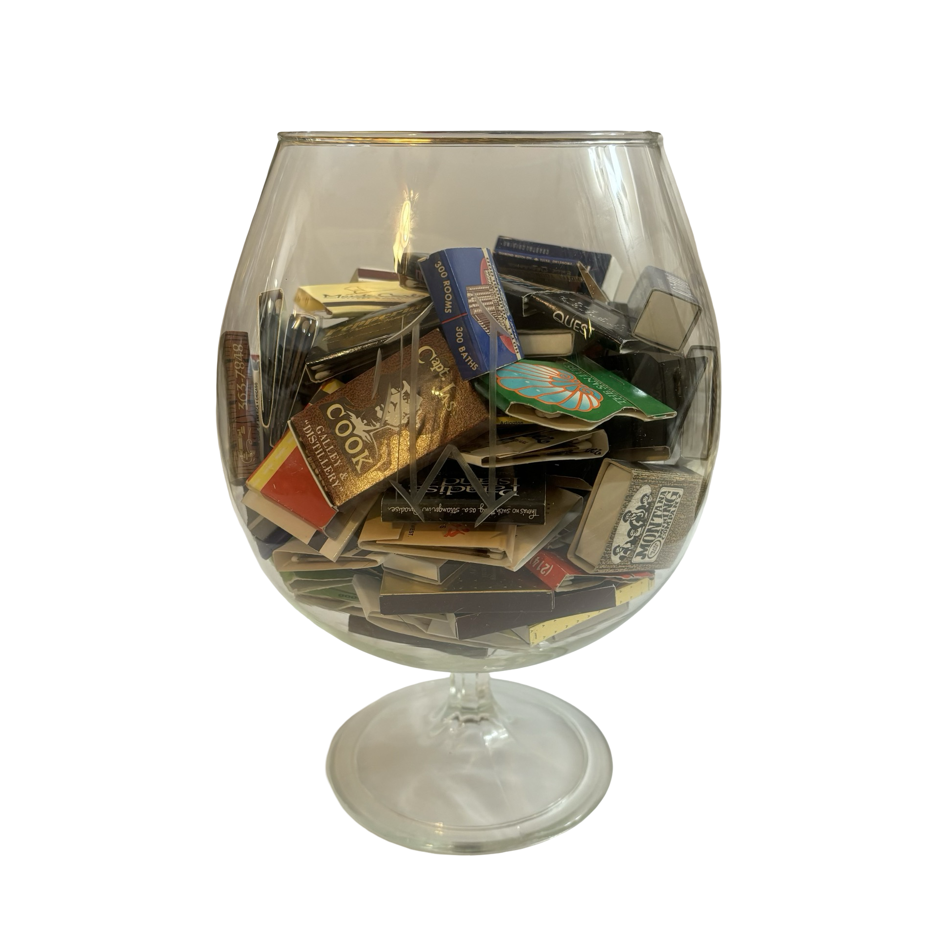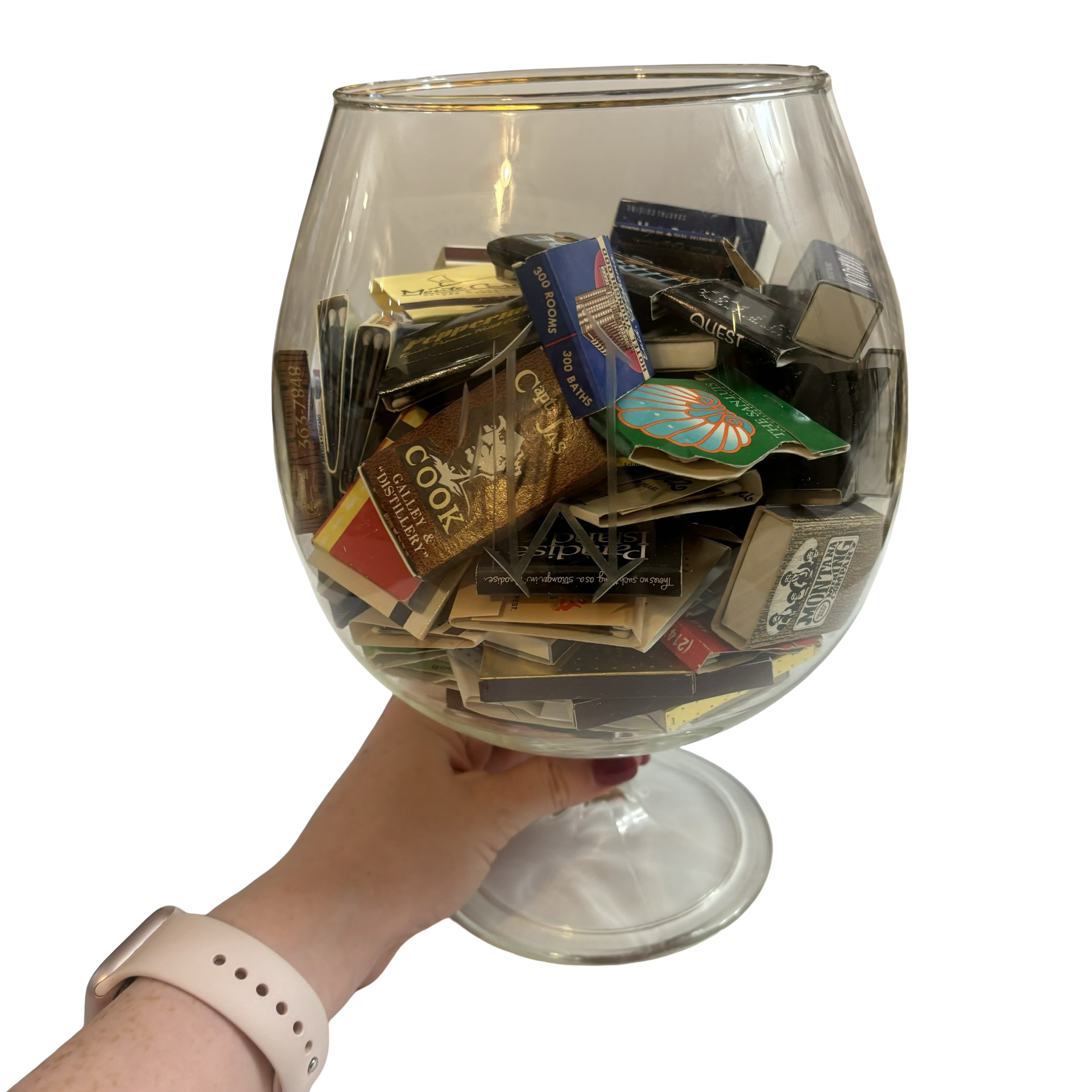 A beautiful large glass pedestal bowl with an engraved gothic W on one side filled with a variety of vintage matches.