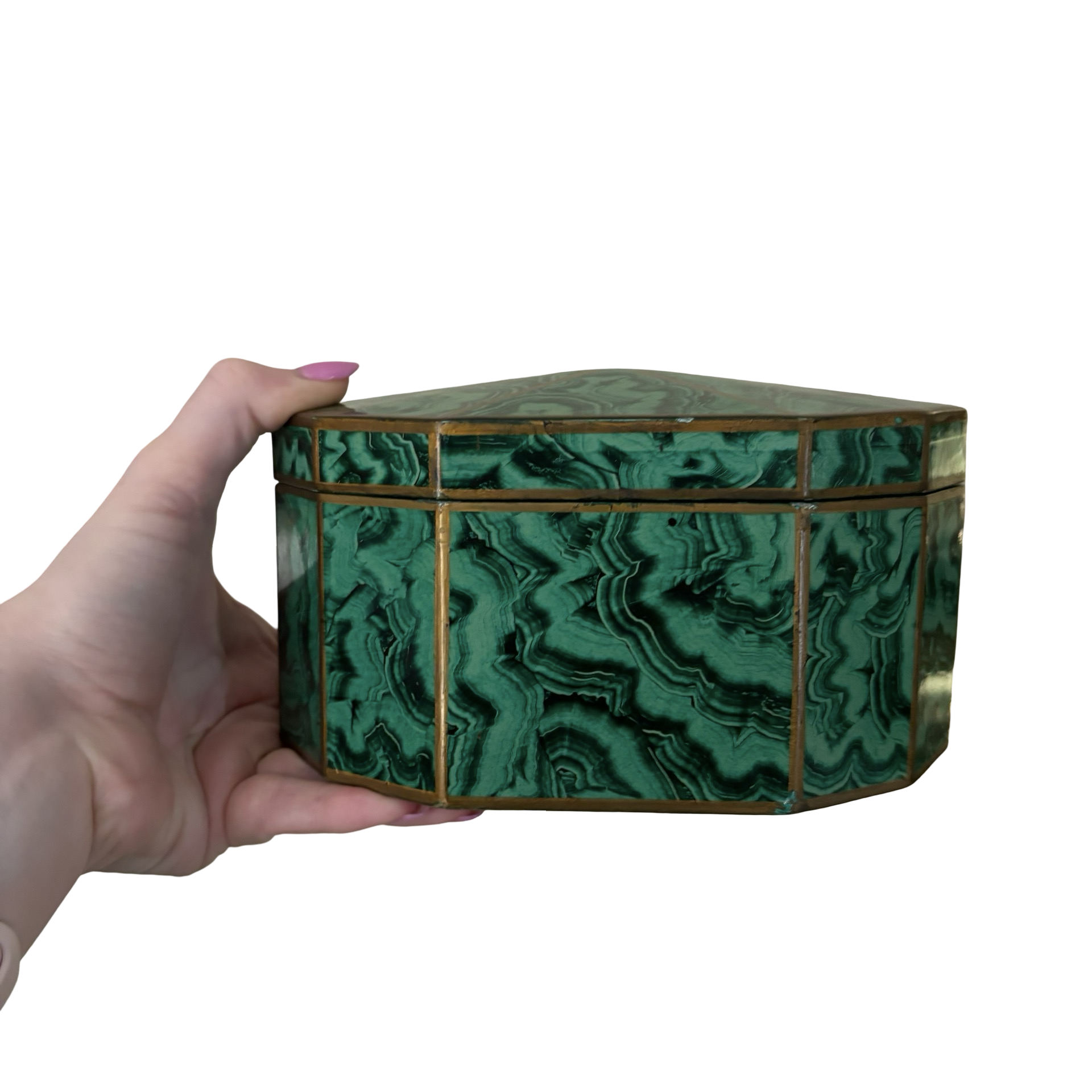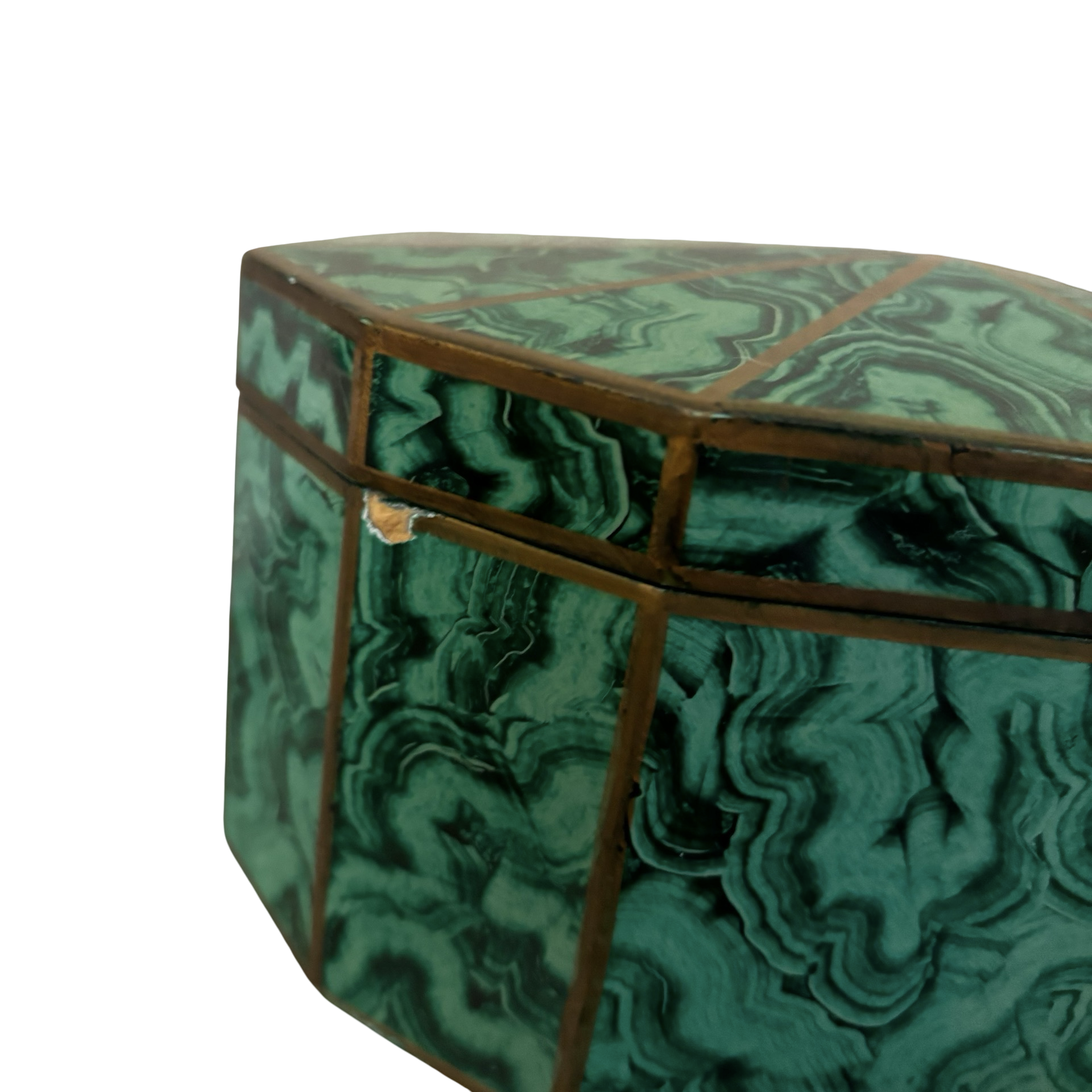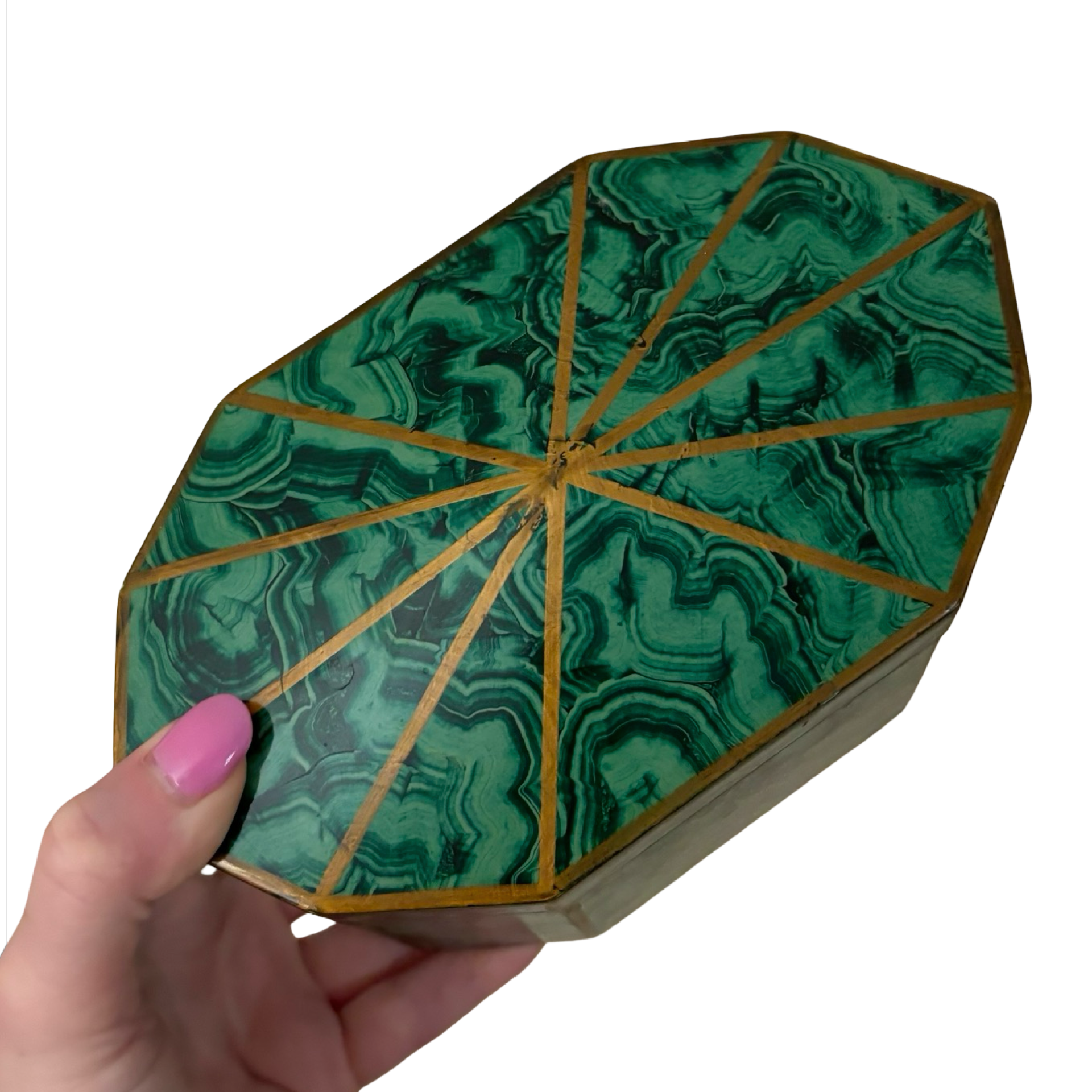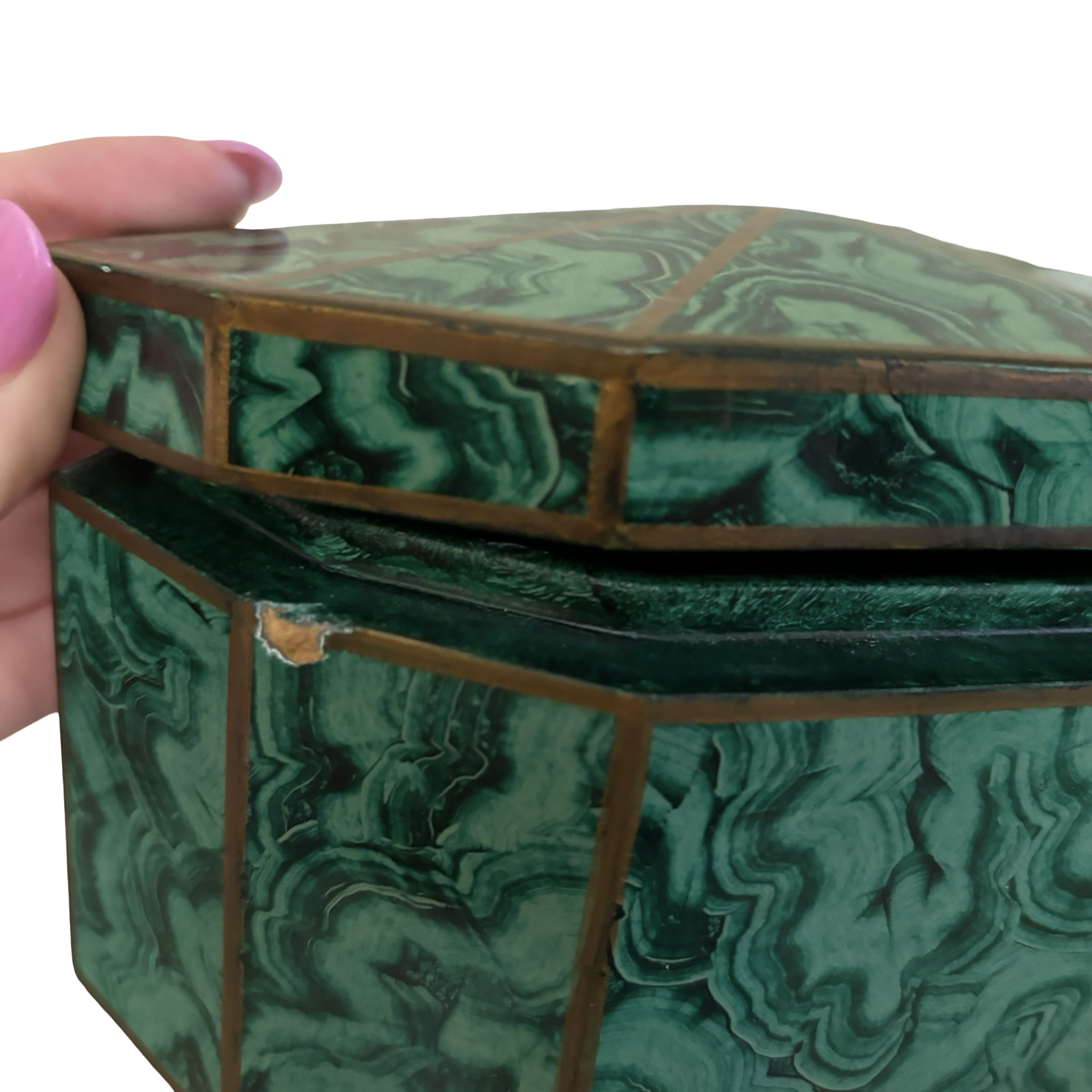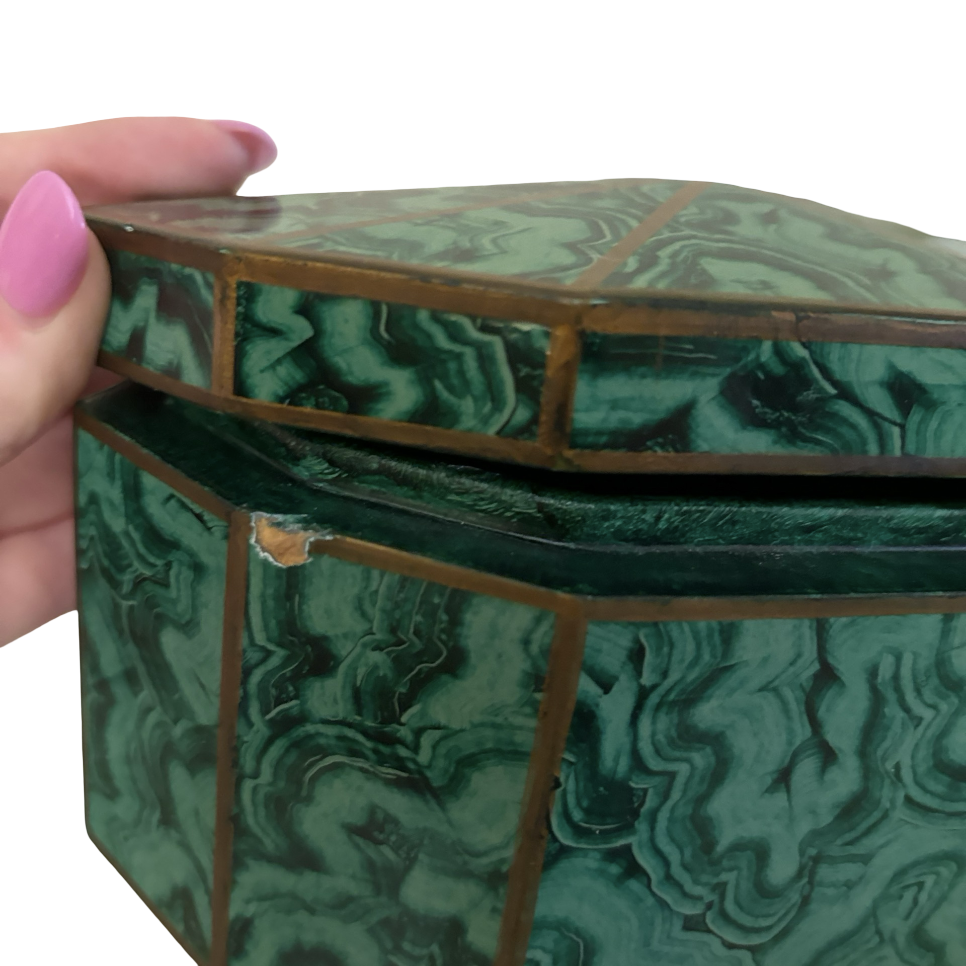 A stunning box made by the vintage master of boxes- Maitland Smith. Made of wood with a faux malachite finish, this stunning piece will add a pop of color to your space. One small chip on the rim (pictured).