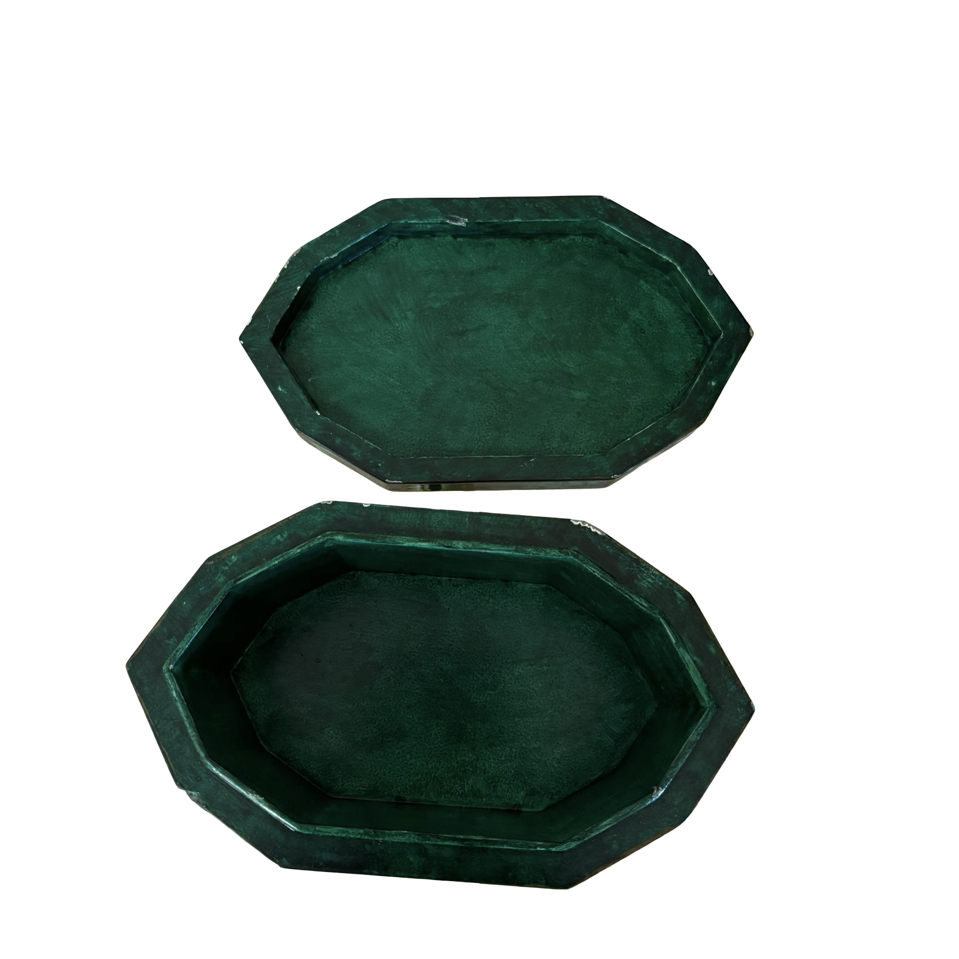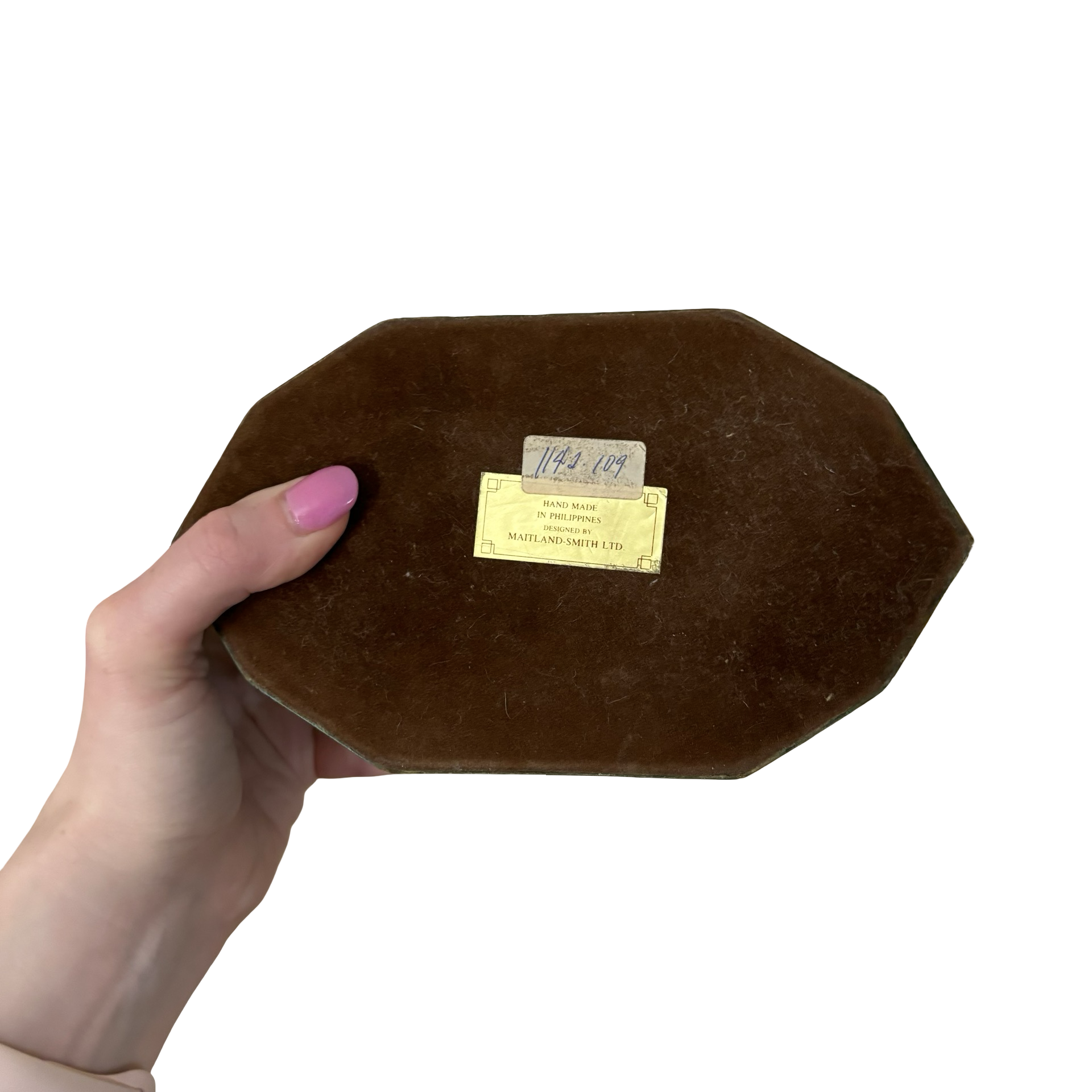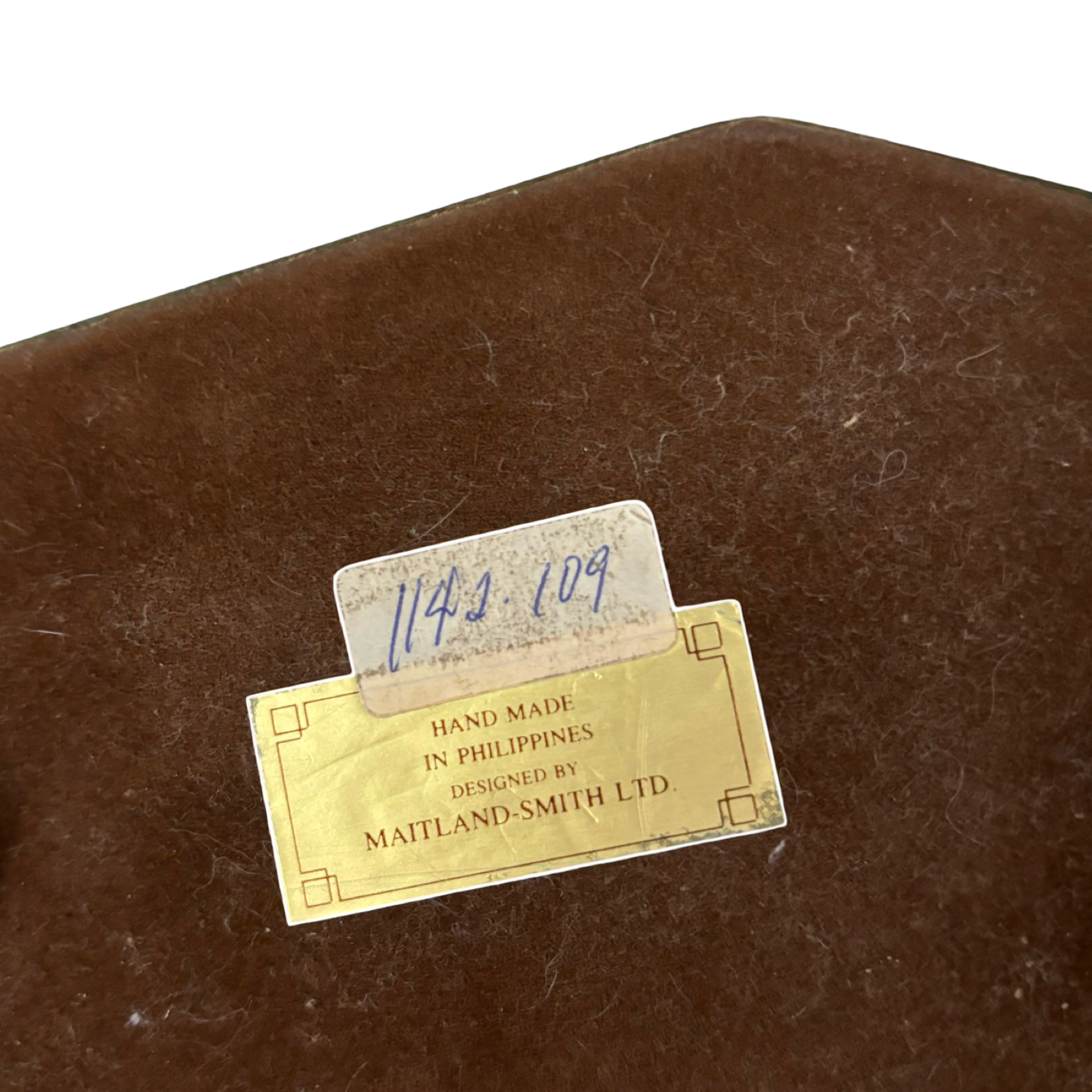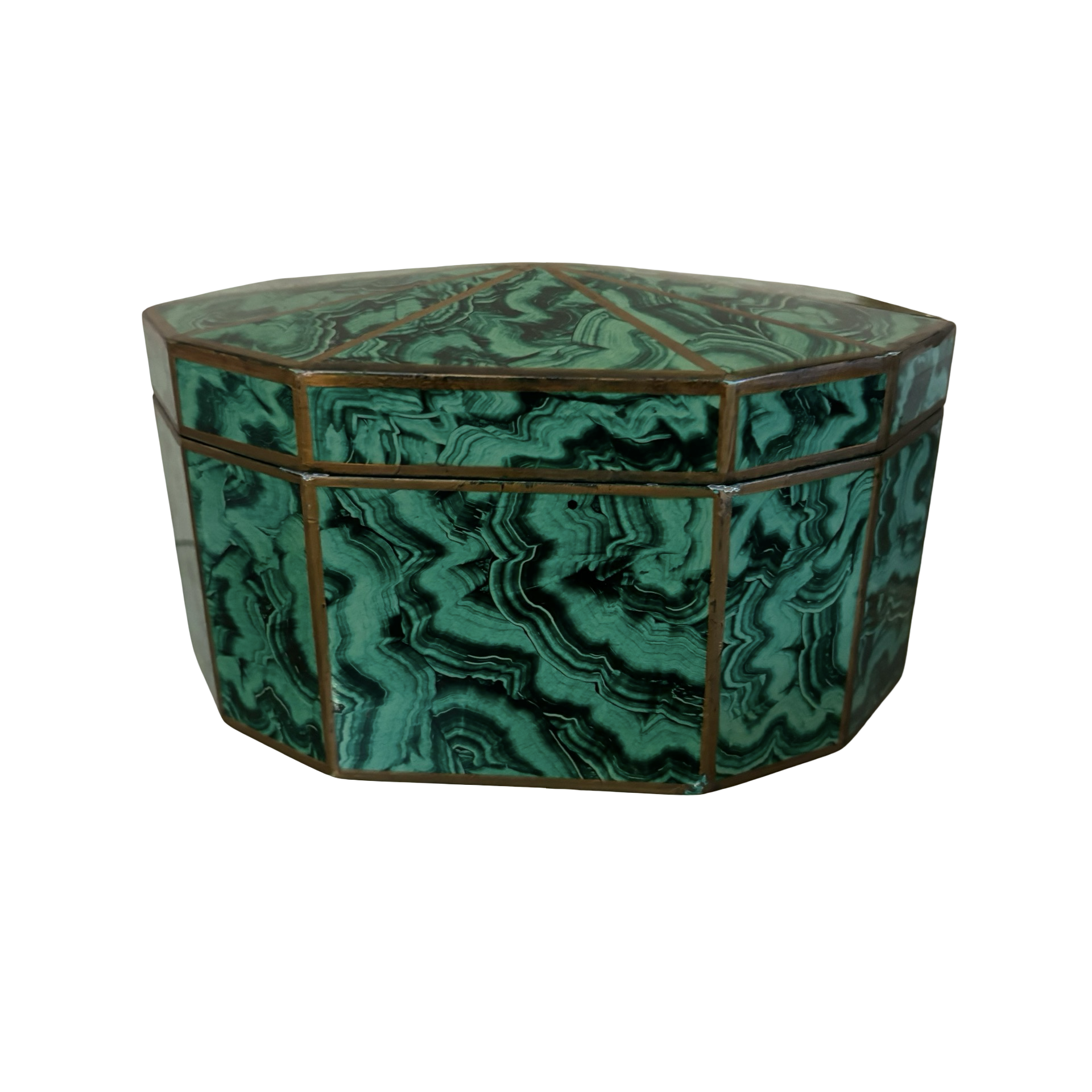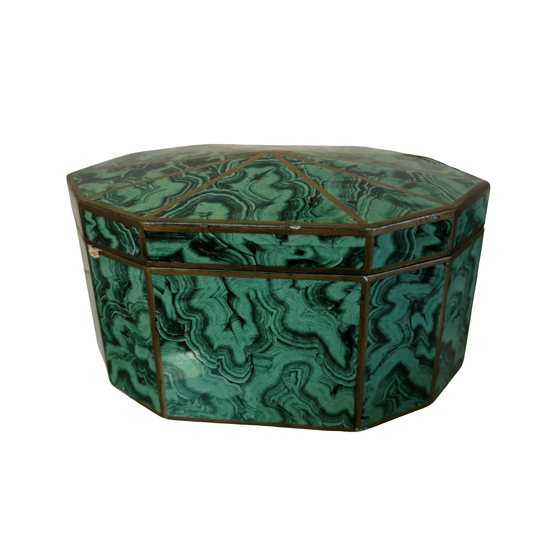 A stunning box made by the vintage master of boxes- Maitland Smith. Made of wood with a faux malachite finish, this stunning piece will add a pop of color to your space. One small chip on the rim (pictured).