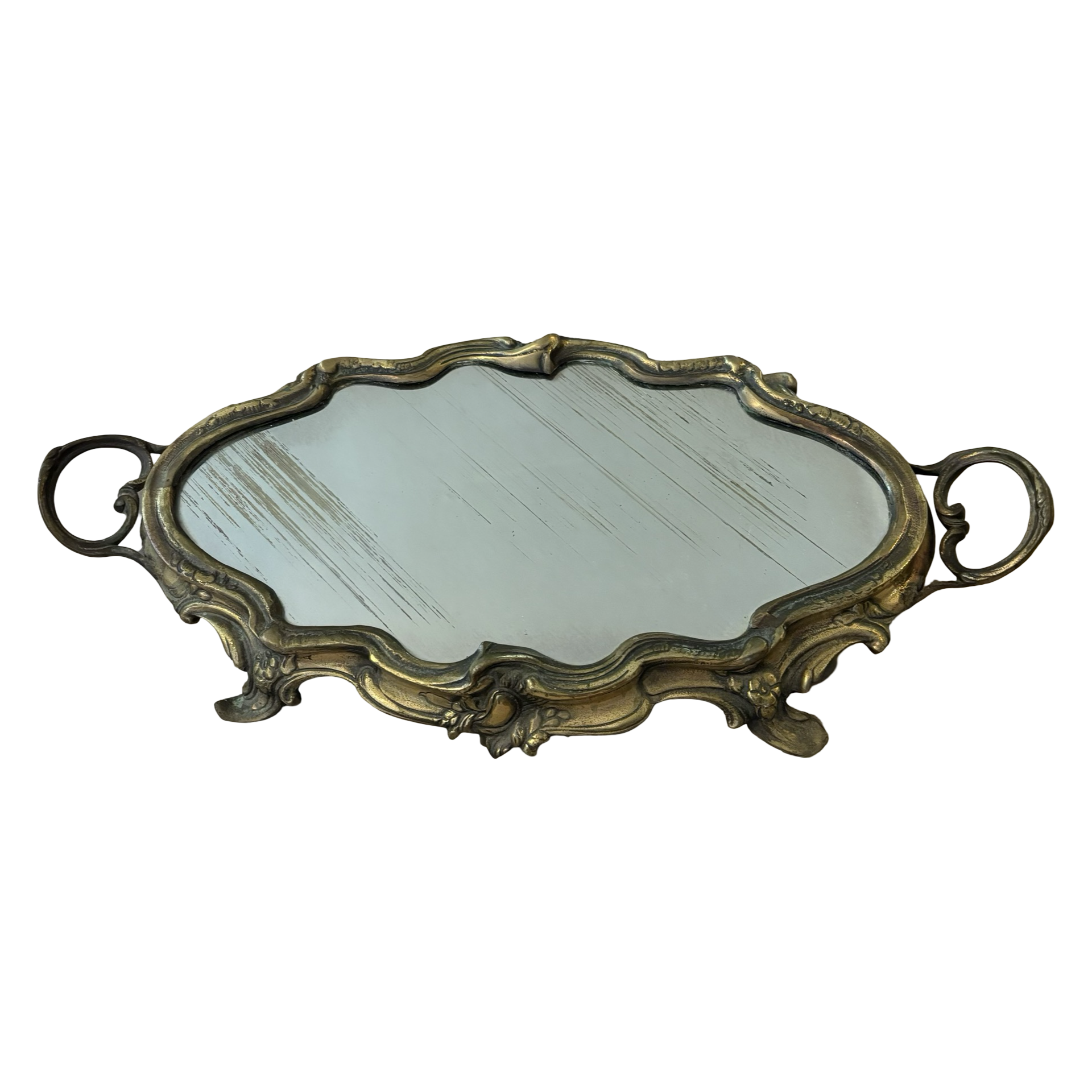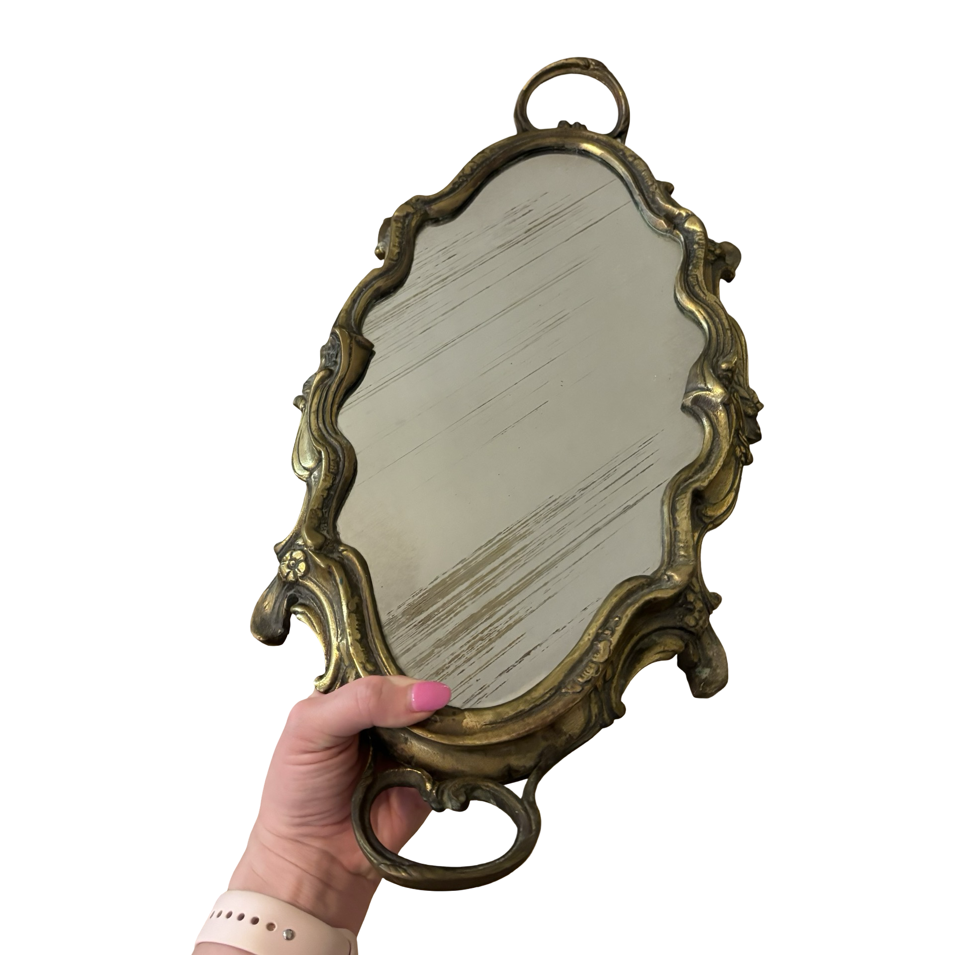This vintage ornate French bronze mirrored tray is quite literally everything. Aged mirror, chunky brass base, sculptural handles- this piece is perfection.