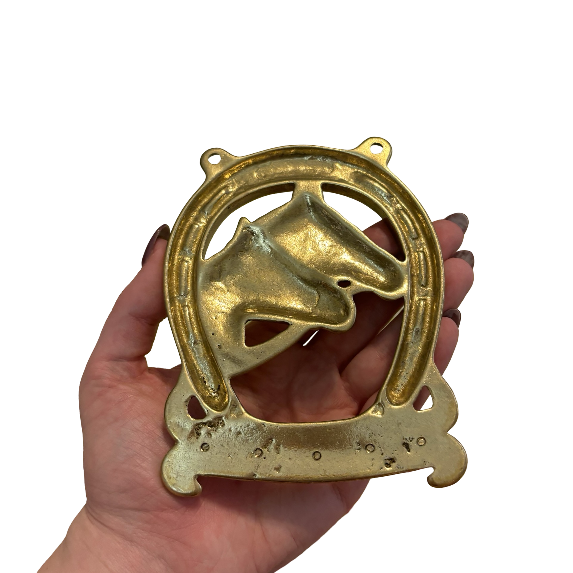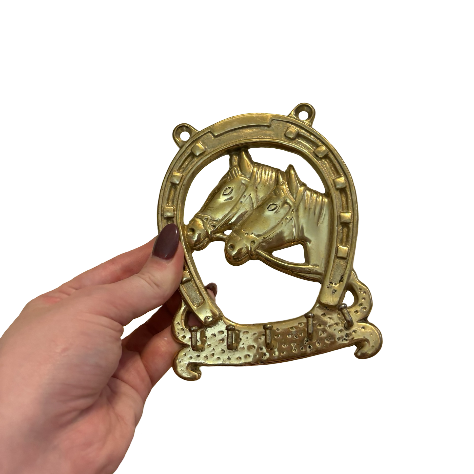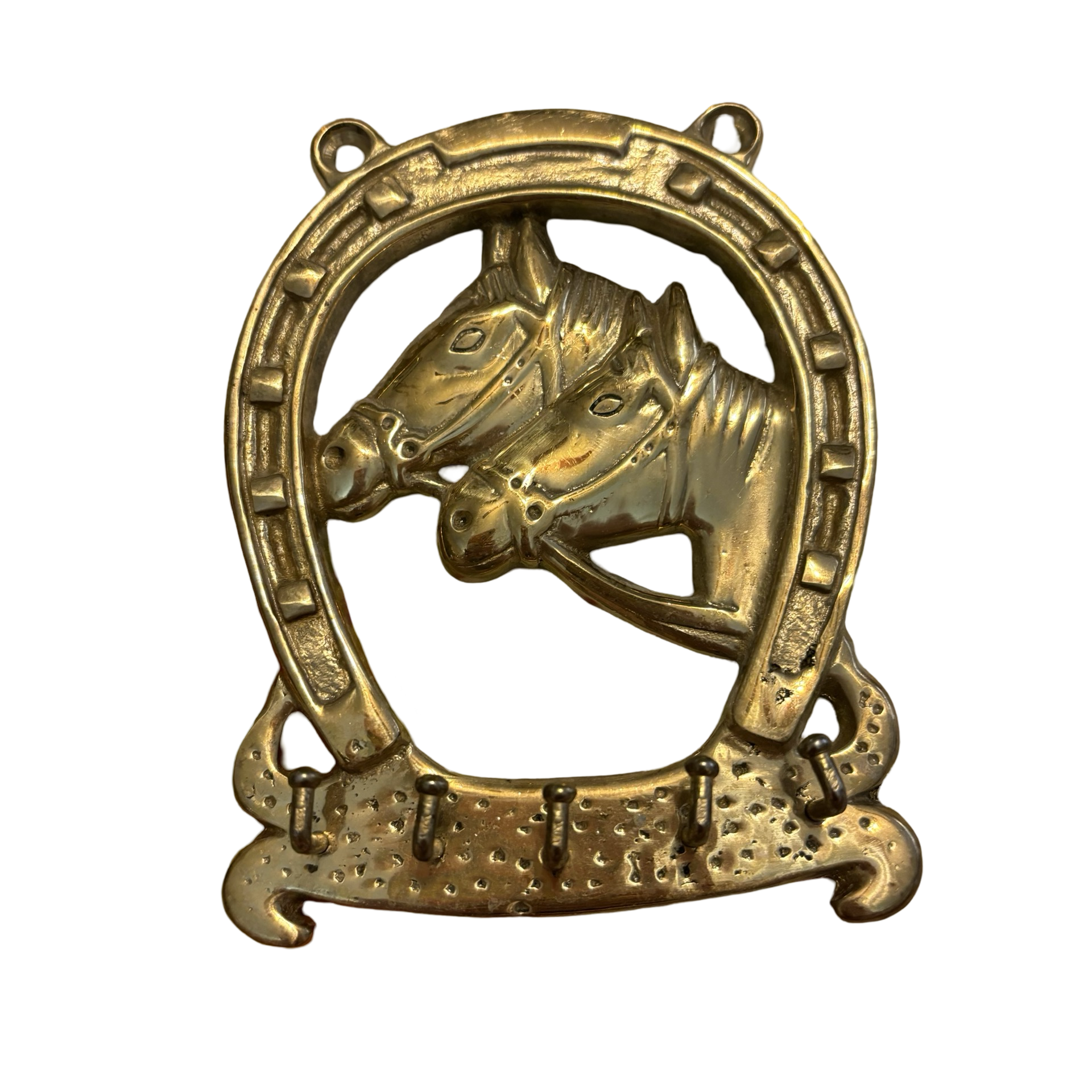 A beautiful vintage brass wall hook featuring a horse and horseshoe.
