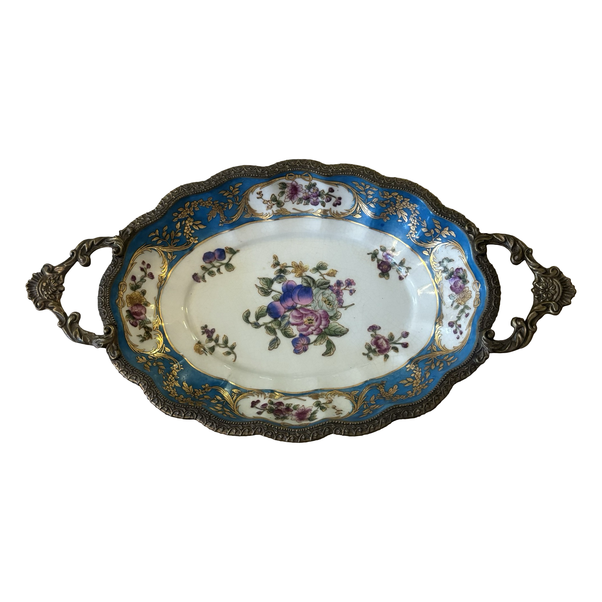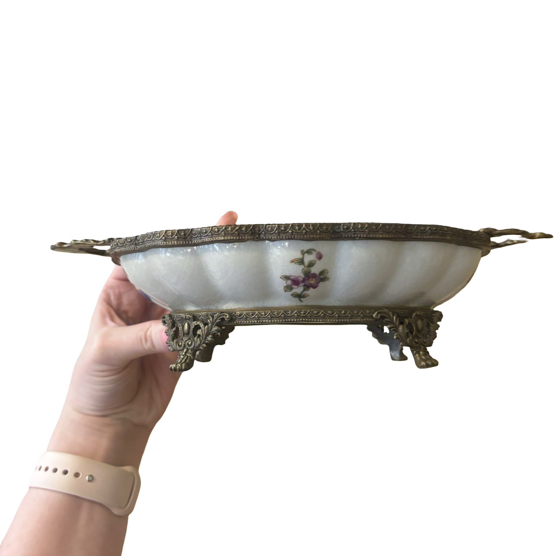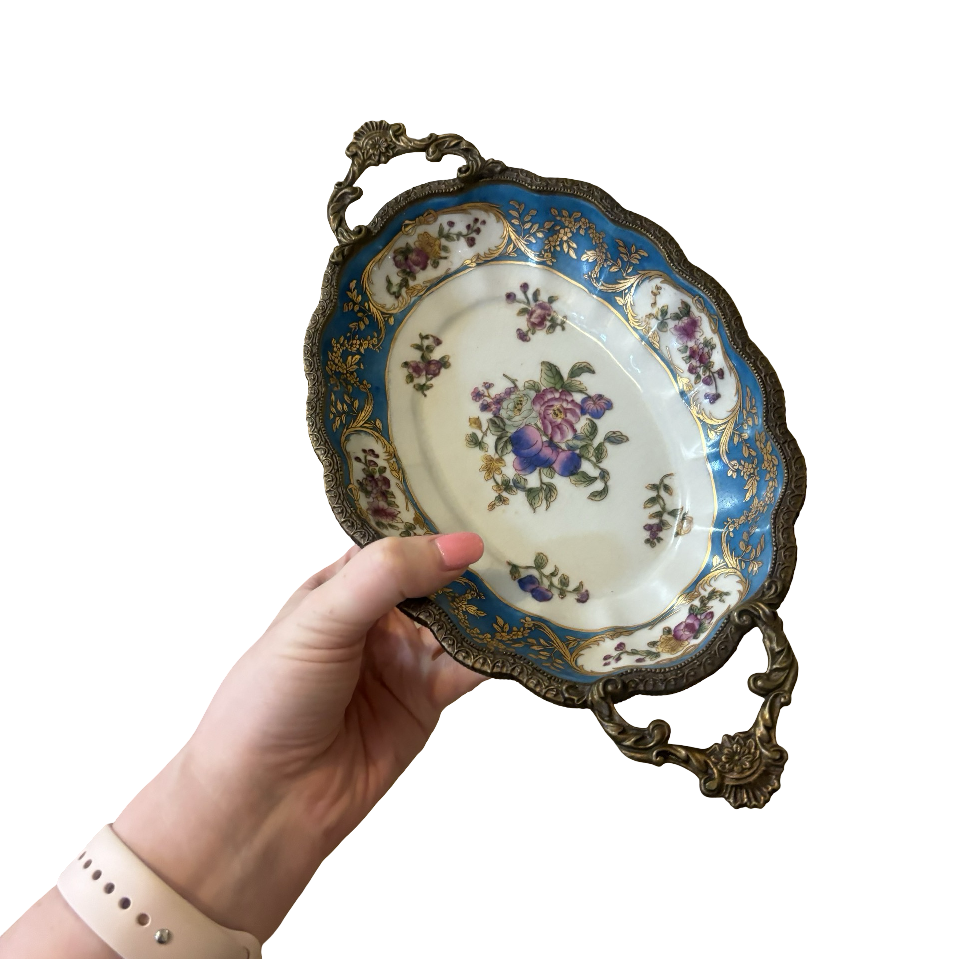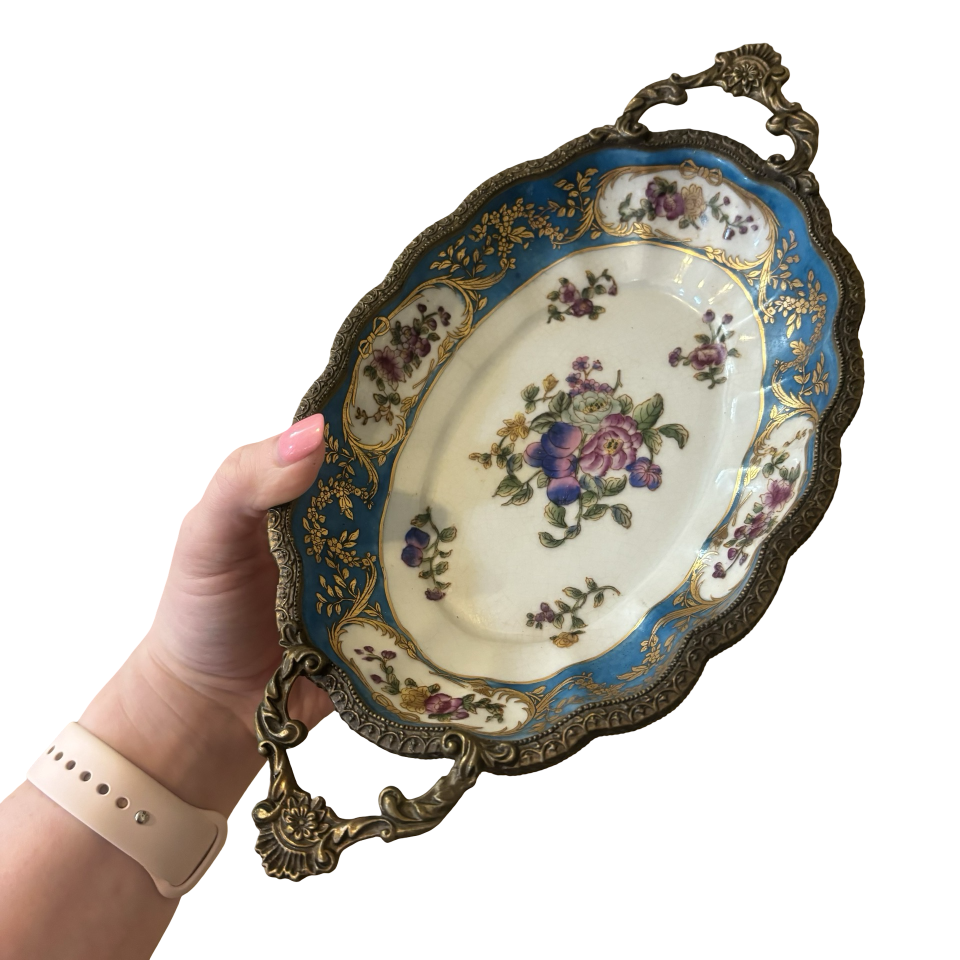A stunning porcelain tray with bronze rim and feet. This stunning tray is so intricately designed! I have three of these trays in varying sizes- this one is medium sized!