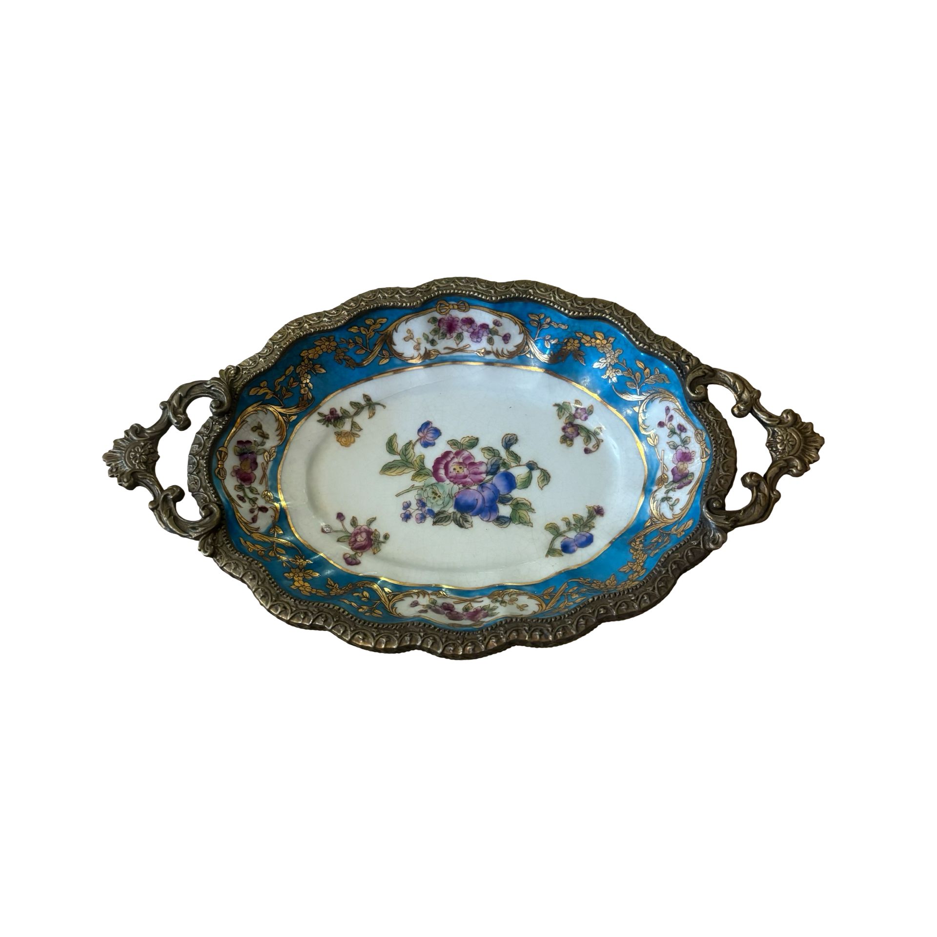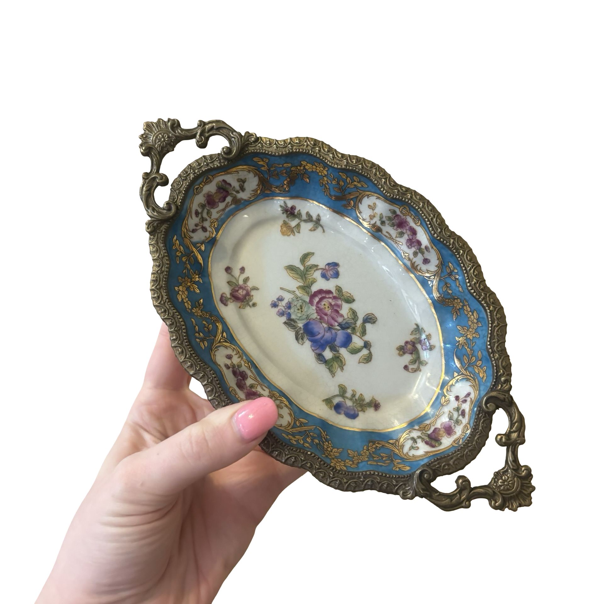 A stunning porcelain tray with bronze rim and feet. This stunning tray is so intricately designed! I have three of these trays in varying sizes- this one is the smallest!