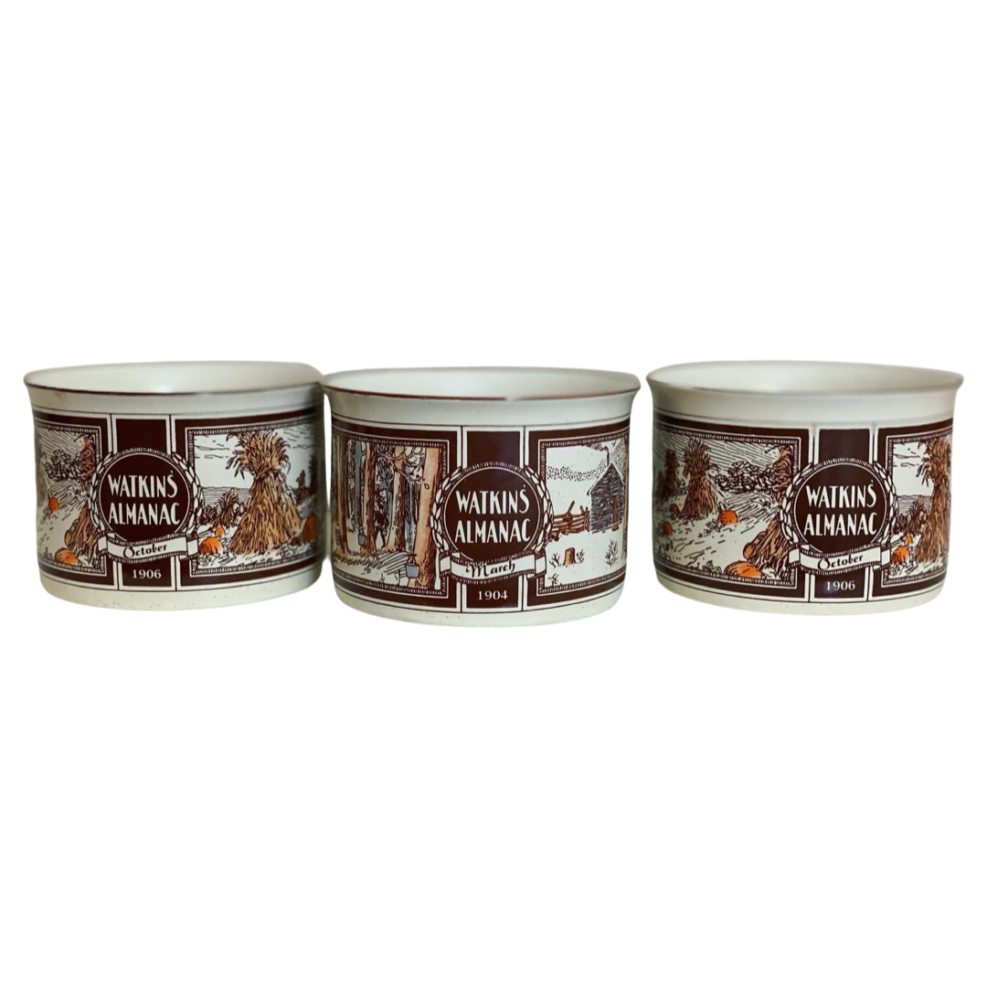 Set of three seasonal Watkins’ Almanac soup crocks in good vintage condition.