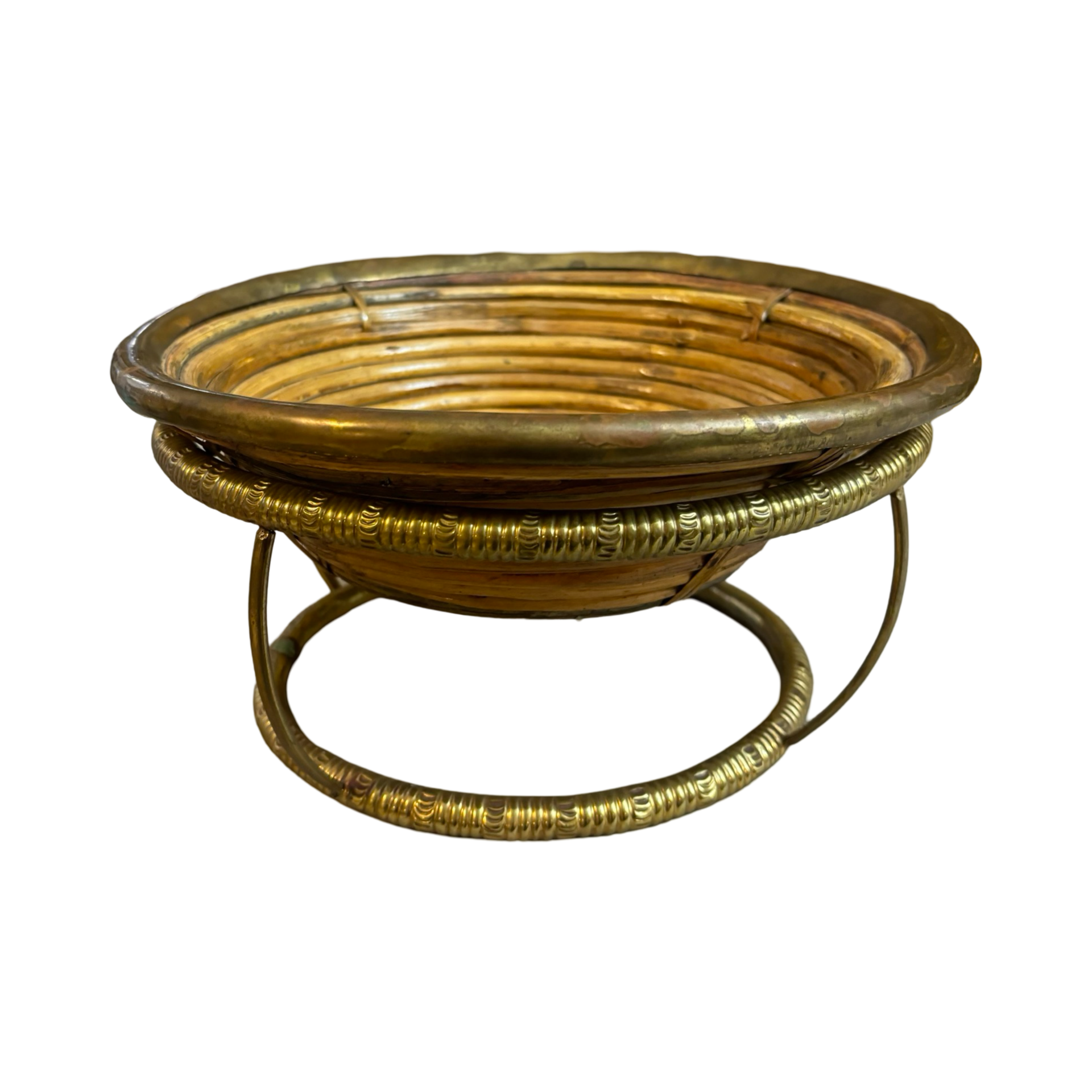A stunning rattan bowl with a brass rim and a brass stand in good vintage condition in the style of the one and only Gabriella Crespi. This is a true collectors item!