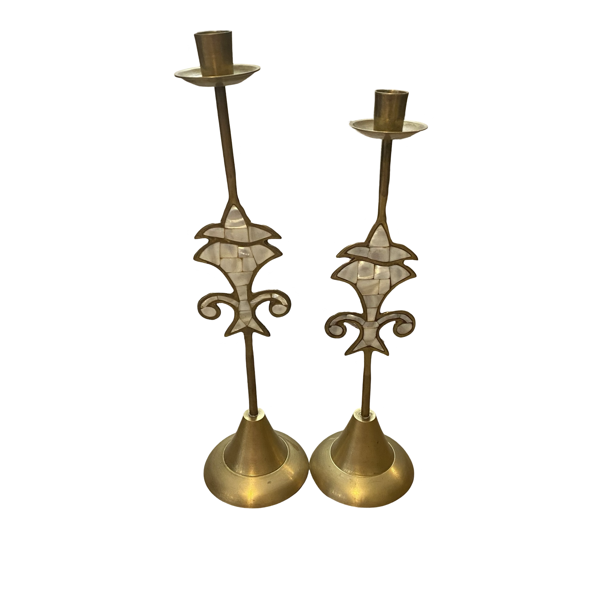 A vintage brass candlestick duo with mother of pearl inlay. They do lean slightly.