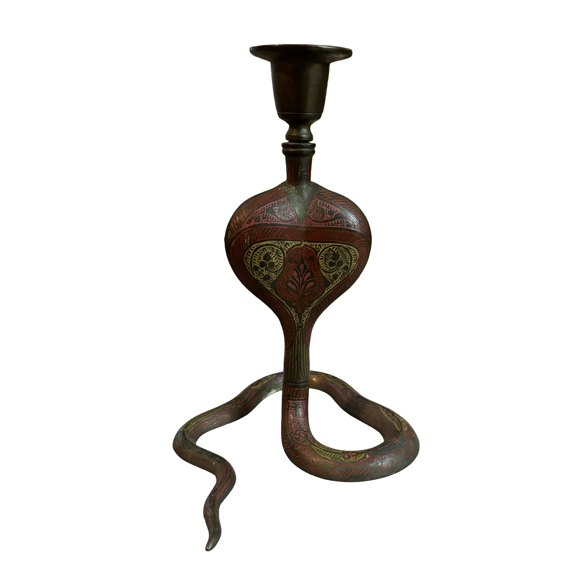 A rare and intricate vintage brass snake candleholder in good condition. The enamel is simply stunning!