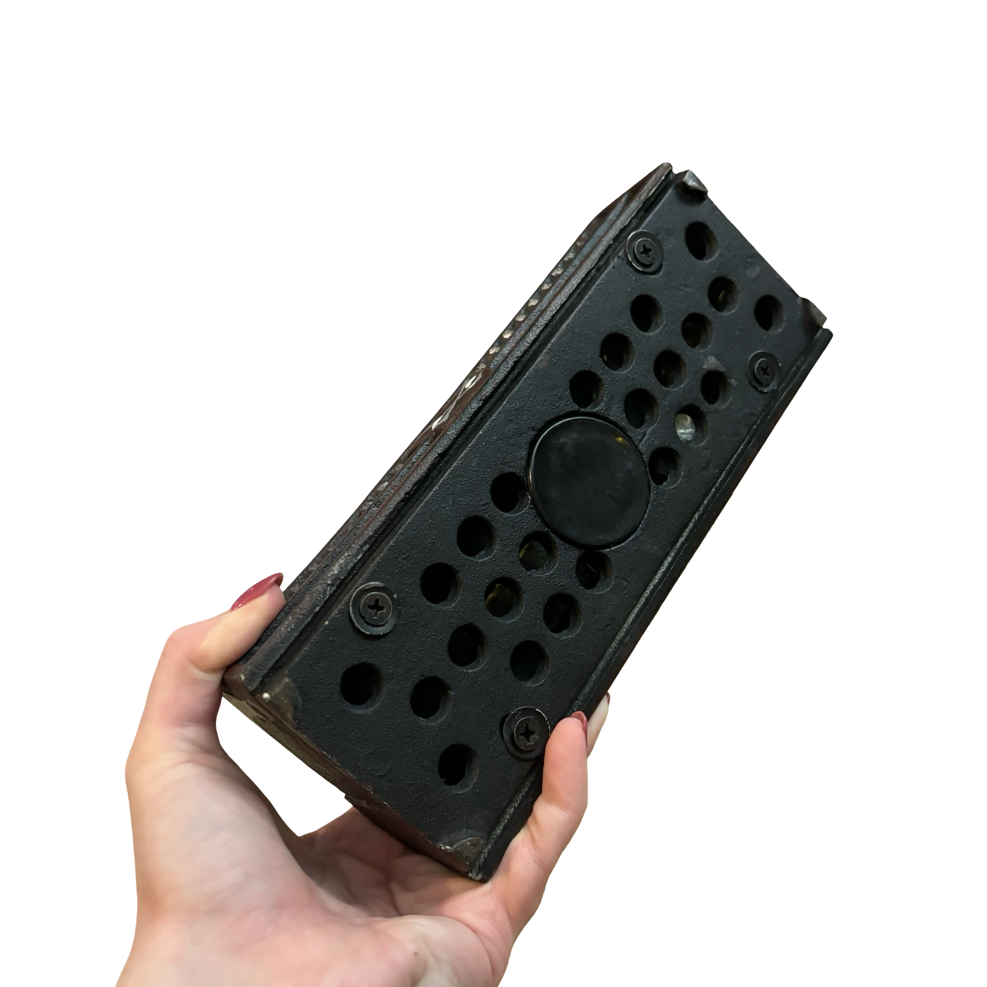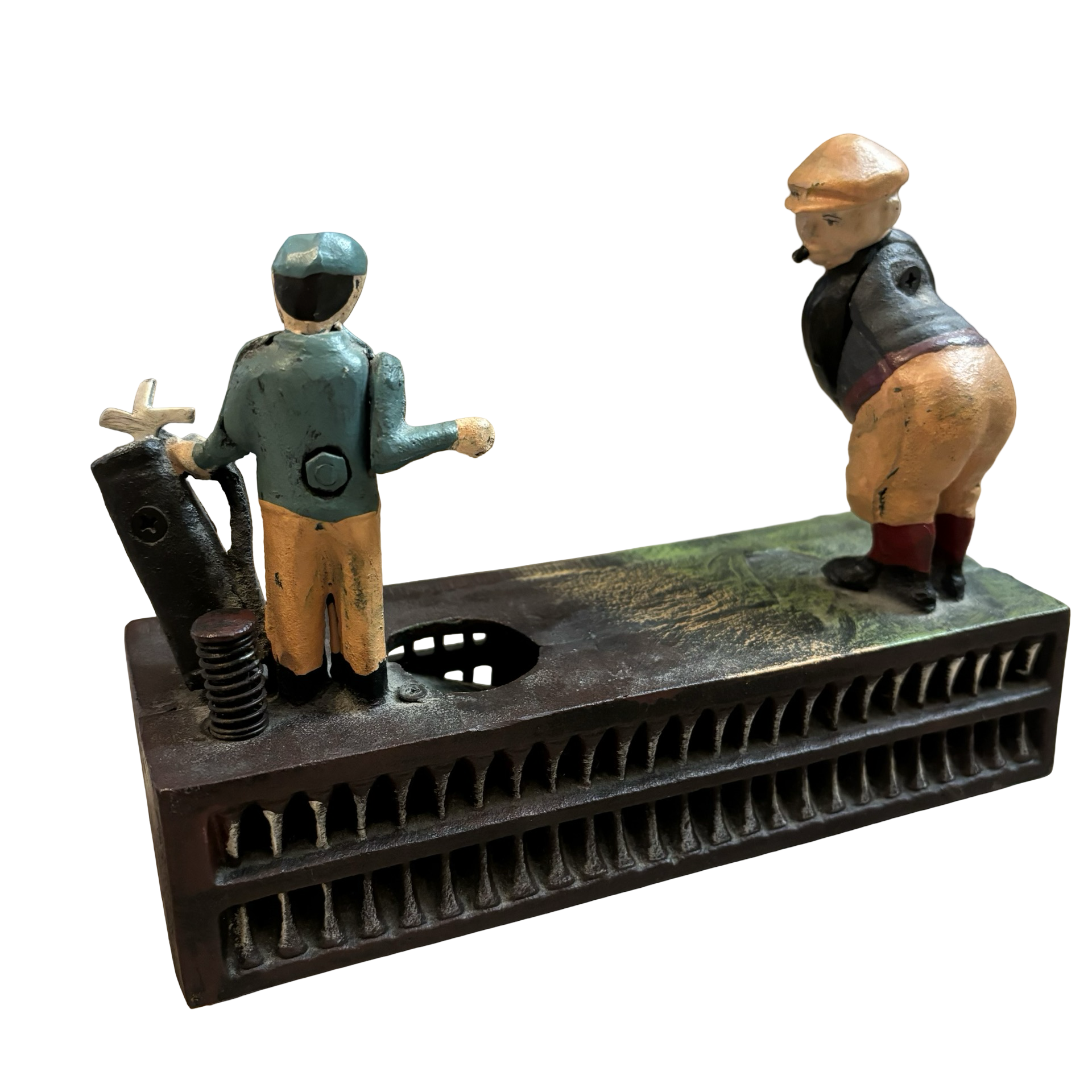 This vintage bank is too cool! The putter swings forward when the button behind the caddie is pressed to “putt” your coin in to the bank! It weighs over five pounds and is in good vintage condition (the caddie is missing his flag).