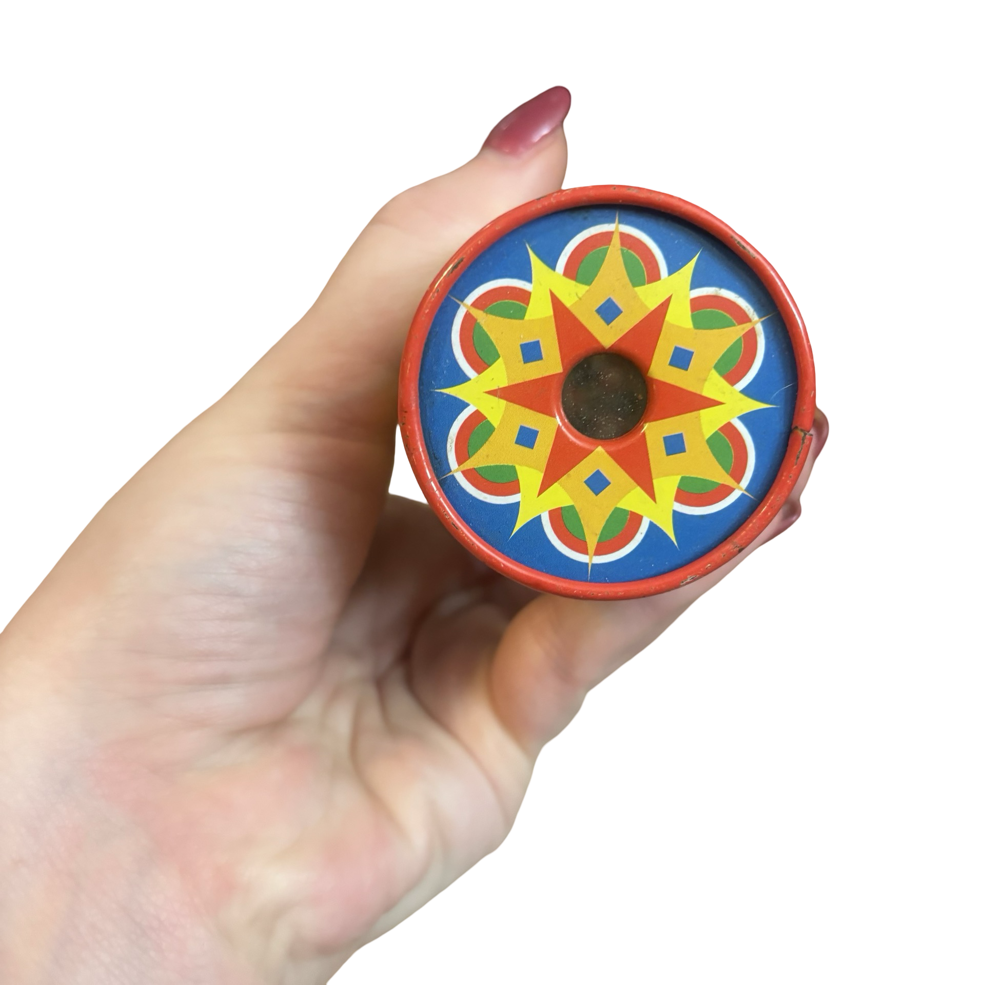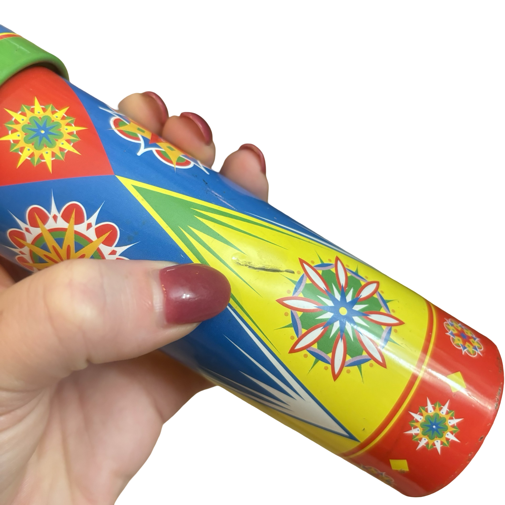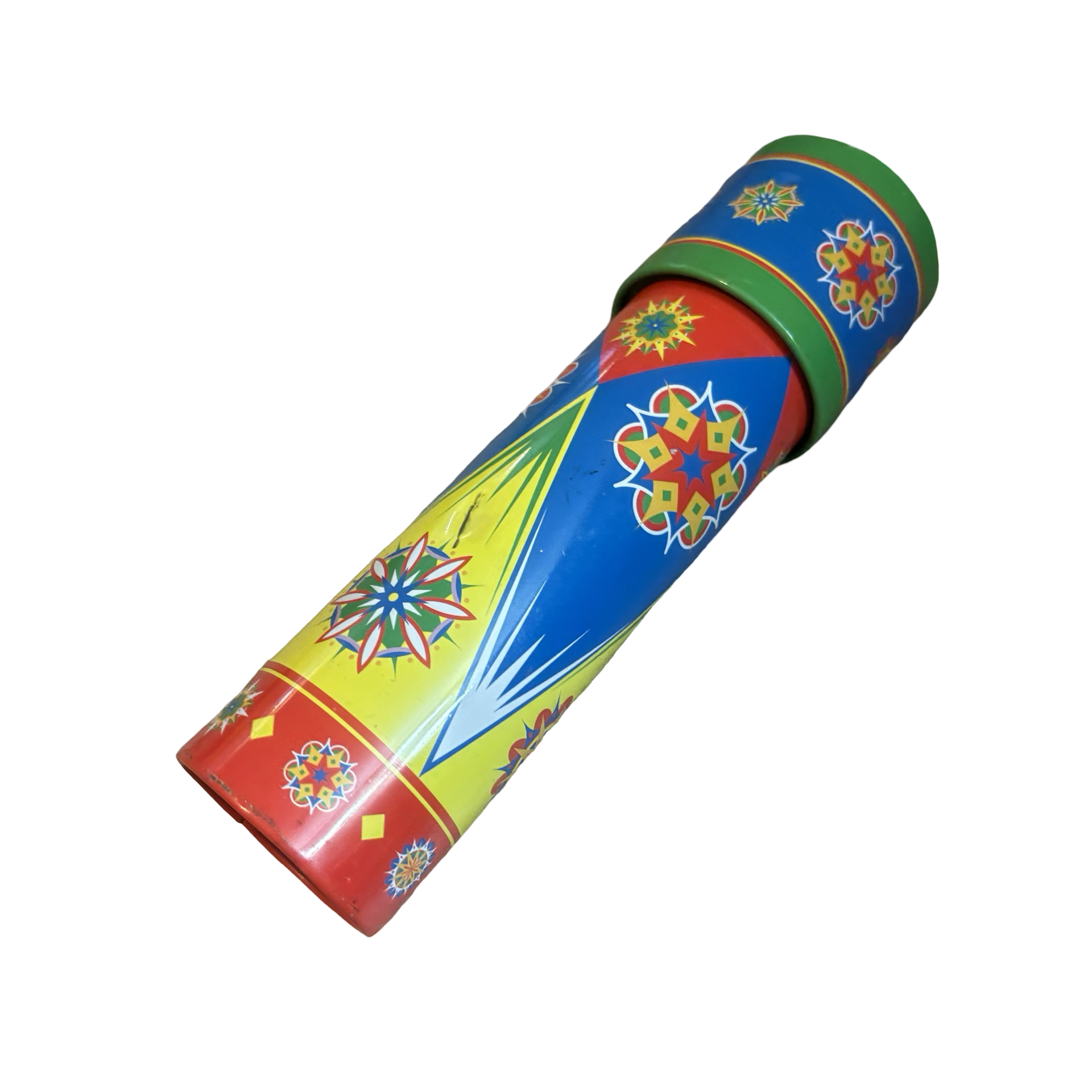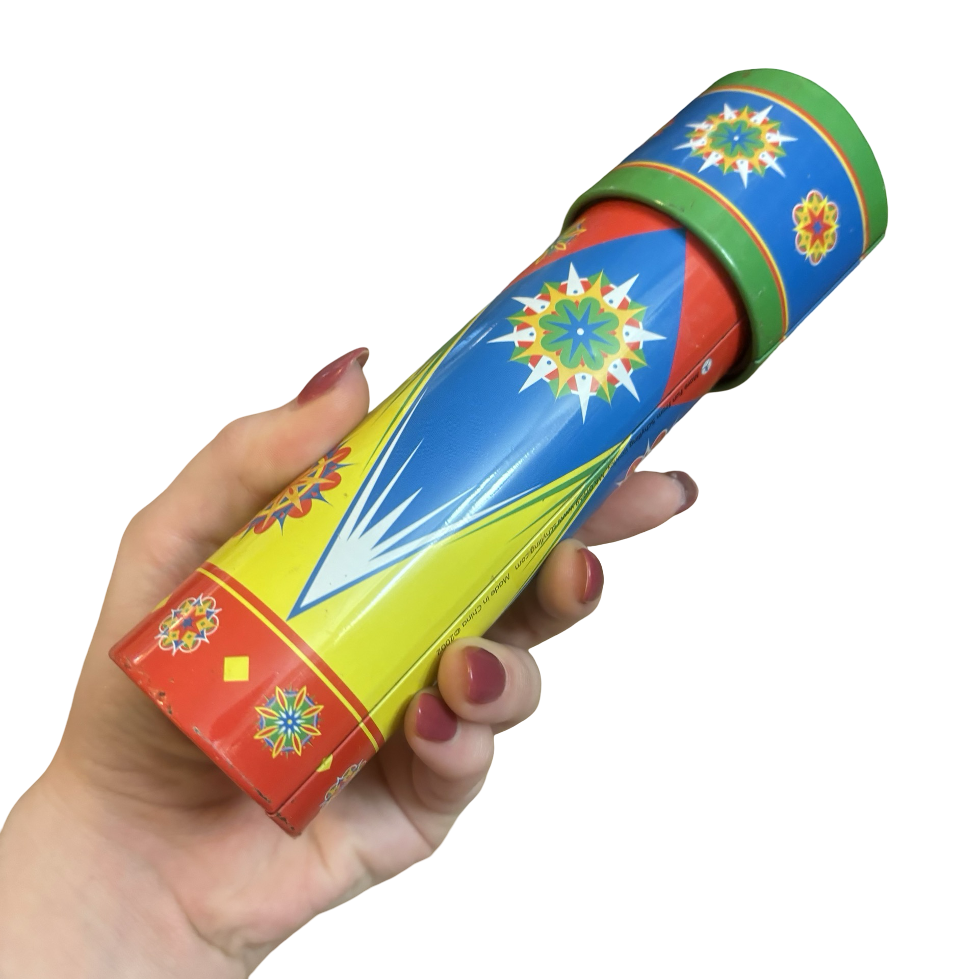 A fabulous and colorful vintage kaleidoscope in good condition with one small dent (photographed).