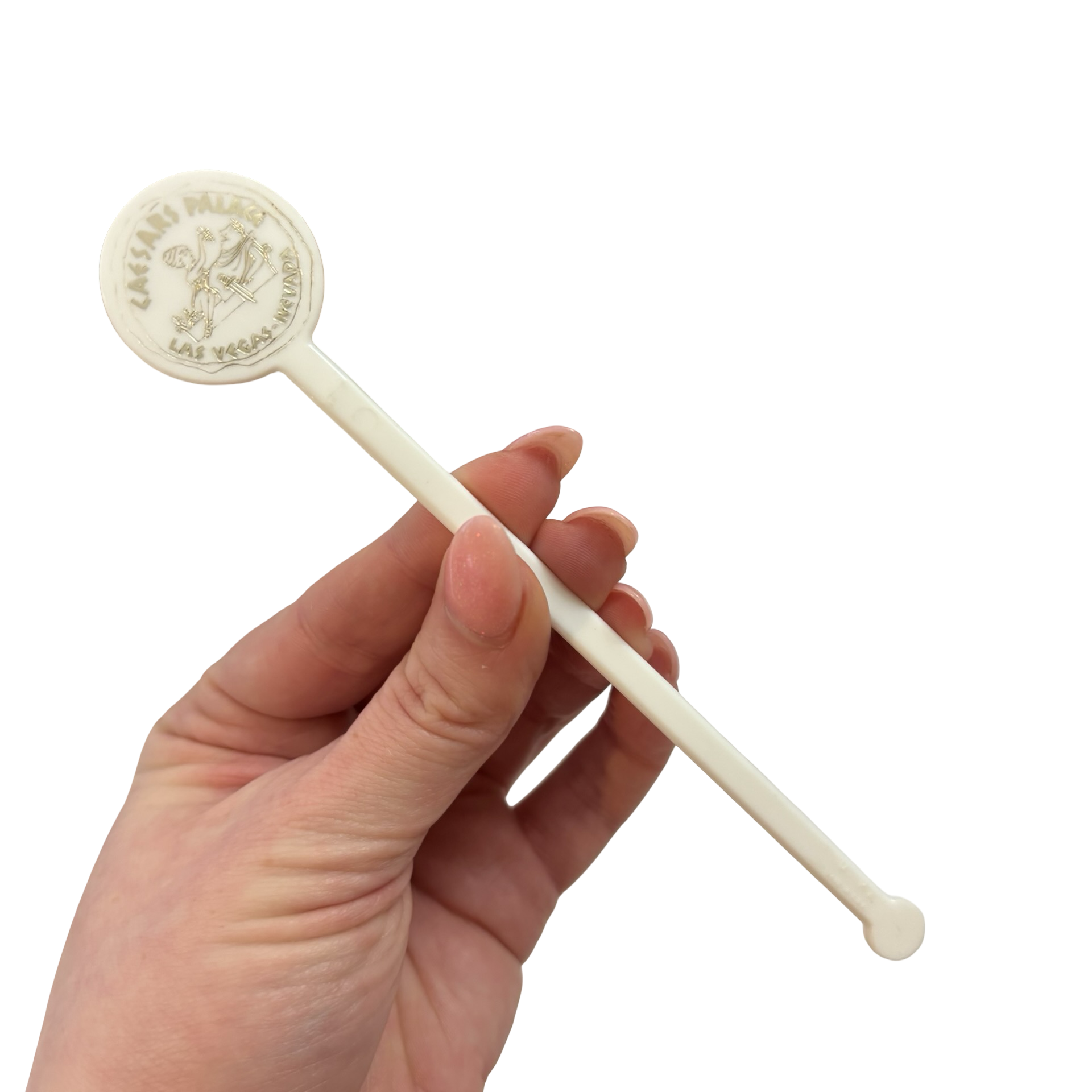A set of five vintage plastic Vegas themed cocktail stirrers, including Caesar's Palace, Mirage and Playboy. Some discoloration present on the Playboy stirrer.